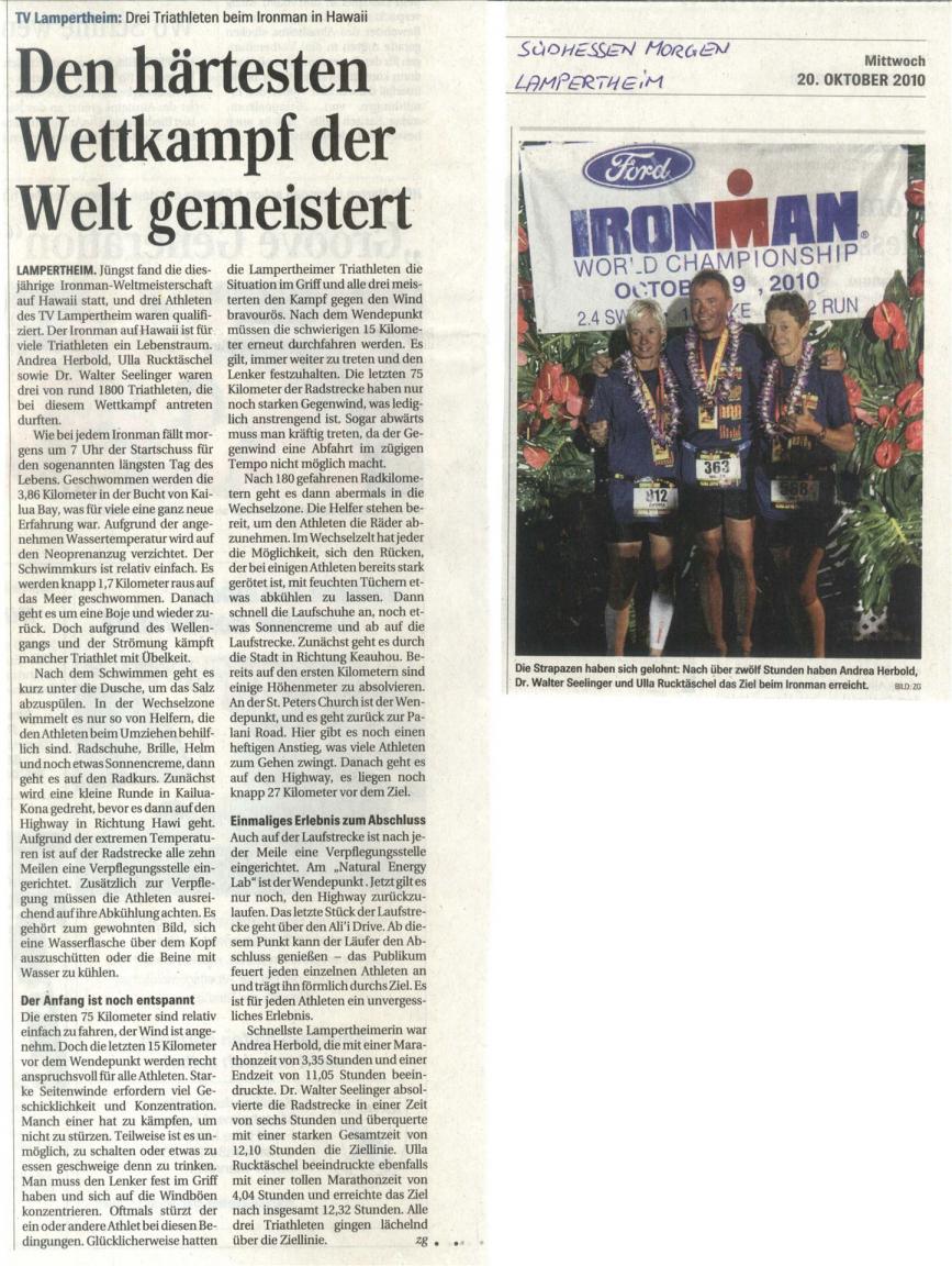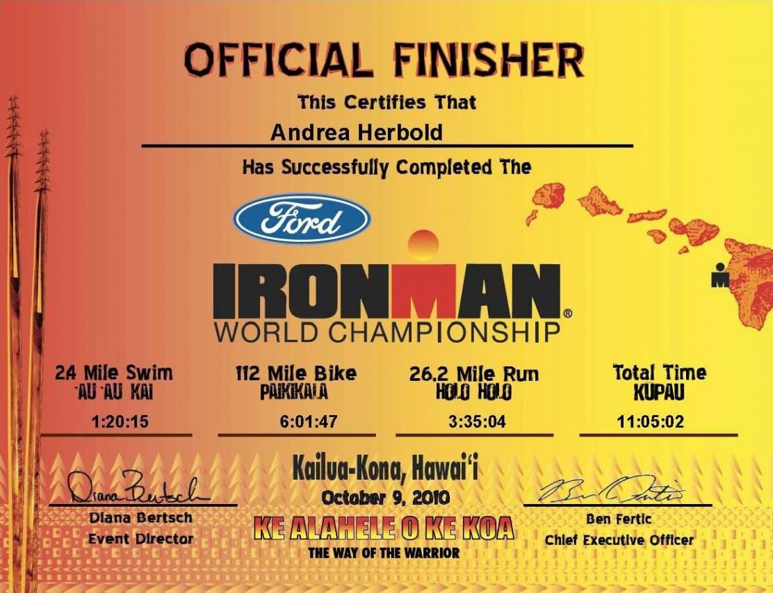 Aufgrund der Wärme, die Sonne strahlt unbarmherzig beschließe ich, nicht am Limit zu laufen. Da ich nicht weiß, wie mein Körper das Klima verkraftet, gehe ich lieber auf Nummer sicher. Ich wähle ein für mich angenehmes Tempo und laufe nun von Verpflegungsstelle zu Verpflegungsstelle. An jeder Verpflegung halte ich an und trinke etwas, ich denke das ist sehr wichtig für den Körper. Ansonsten nehme ich alle greifbaren Schwämme und fülle mir Eiswürfel unter die Mütze. Diese leichte Abkühlung ist eine Wohltat. Irgendwann komme ich auf die Idee und schütte die Eiswürfel ebenfalls in mein Trikot. Bei jedem Schritt macht das Eis lustige Geräusche. Auf der Laufstrecke in Kona sind relativ viele Leute am Straßenrand. Viele rufen die Startnummer und feuern mich an. Ich kann jeden Meter dieses Laufes genießen. Ich fühle mich vom ersten Meter an gut und bin auch zuversichtlich, dass ich ins Ziel komme. Dann geht es auf den Highway. Hier gibt es keinerlei Schatten mehr, der Asphalt strahlt die Hitze ab. Jetzt muss ich „nur“ noch bis zum Energy Lab und wieder zurücklaufen. Das sind nur noch ca. 17 Meilen. Aber es stört mich in keinster Weise. Ich freue mich, winke den Zuschauern zu und versuche möglichst viele Leute zu überholen. Mein Magen fängt leider an etwas zu rebellieren, daher trinke ist vorerst fast nichts und kühle nur von außen. Ich hoffe, das geht vorüber. Während ich raus laufe kommen mir auch viele Leute entgegen. Einige gehen, sie können nicht mehr laufen. Manche Athleten, die ich überhole, rufen mir zu „good job“ das finde ich super nett. Unterwegs steht auch Hannes mit seinen Leuten und machen Party. Da läuft man gleich wieder viel leichter. Dann kommt die Abbiegung zum Energy Lab. Hier ist auch eine tolle Stimmung. Es ist jedoch noch ein langes Stück zum Meer und dann geht es noch einmal rechts ab. Am Wendepunkt stehen 3-4 Männer und feuern die Leute an. Ich tanze etwas mit ihnen und jubel ihnen zu, die freuen sich total. So, jetzt heißt es nur noch zurücklaufen. Nur noch, es sind sicherlich noch 12-13 km. Aber was ist das schon. Mir geht es gut ich fühl mich sauwohl. Wieder auf dem Highway angelangt läuft mir Walter entgegen. Es geht ihm ebenfalls gut er winkt und ruft mir zu. Jetzt habe ich das Gefühl ich bin auf dem Heimweg. Bei den Verpflegungsstellen stehen sie inzwischen mit großen kalten Wasserflaschen da und fragen, ob sie einem Wasser über den Kopf schütten sollen. Ich bin dankbar für jede Abkühlung und sage nicht nein. Vor mir läuft ein junger Mann, auf einmal bleibt er stehen, die Beine ganz starr. Er hat einen furchtbaren Krampf. Ich frage ihn, ob ich ihm helfen kann, er winkt jedoch nur ab und sagt, ich soll weiterlaufen. Die Strecke zurück zieht sich dann doch noch. Ich halte noch immer an jeder Verpflegungsstelle an, ich gehe auf Nummer sicher. Unterwegs hatte mal mein rechter Oberschenkel etwas weh getan, aber das ging irgendwie wieder weg. Ein Radfahrer fährt ein Stück auf dem Highway neben mir her und ruft Lampertheim Go. Es ist ein Deutscher der mich anfeuert. Er meinte ich wäre sicherlich ein Daylight Finisher. Ich rufe ihm zu, dass ich keine Ahnung habe, da ich keine Uhr dabei habe. Er meinte nur, du bist sicherlich noch bei Tageslicht im Ziel. Auf dem letzten Stück habe ich eine Frau ca. in meinem Alter überholt. Sie hat mir zugerufen „good job“ und sich an mich drangehängt. Wir sind dann eine ganz Zeit zusammen gelaufen. Das fand ich sehr angenehm. Irgendwann hat sie abreißen lassen, ich hab dann etwas langsam gemacht und gesagt, sie solle doch mit weiterlaufen. Sie meinte dann, nein sie kann nicht mehr so schnell und dann bedankte sie sich noch, dass ich sie mitgezogen habe. Dann kommt lediglich noch ein Anstieg auf dem Highway, wobei man inzwischen jeden Höhenmeter in den Knochen merkt. Wieder in Kona angekommen geht es nur noch die Palani Road runter. Abwärts laufen ist inzwischen auch nicht mehr so angenehm. Jetzt noch ein Quadrat laufen. Hier überhole ich noch einige. Es sitzen noch immer viele Zuschauer am Straßenrand und rufen einem zu, dass man gleich im Ziel ist. Auf dem Ali Drive nehme ich Tempo raus und genieße jeden Meter. Ganz viele Leute jubeln mit zu, rufen meine Startnummer oder meinen Namen und klatschen mich ab. Das Gefühl ist unbeschreiblich. Inzwischen kann ich hören, wie der Sprecher bereits meinen Namen, Nation…..und ähnliches ruft. Jetzt sind es nur noch ein paar Meter und ich bin im Ziel. Es geht mir super gut und ich weiß schon jetzt, dass wenn ich die Möglichkeit habe, wieder nach Hawaii kommen werde. Im Ziel bekommt man Blumen und ein Handtuch umgehängt. Eine Betreuerin kümmert sich um mich und führt mich nach hinten. Ich sage ihr, dass es mir gut geht und ich nach meinem Mann suche. Sie fragt mich noch mehrmals ob alles in Ordnung ist bevor sie mich alleine lässt. In der Menge erkenne ich dann auch schon Werner. Er ist super stolz auf mich. Erstaunlicherweise habe ich sofort Lust auf Cola und Pizza. Was ich dann auch in mich rein stopfe. Ich hole noch mein Finisher Shirt und meine Urkunde ab. Zum Nachtisch esse ich noch Vanille-Eis. Das einzige was mir weh tut sind die Füße. Durch die nassen Schuhe und Strümpfe (es war ja alles klatsch nass, da ich ja ständig Wasser über mich geschüttet habe) habe ich mir einige Blasen sogar auf den Fußsohlen gelaufen. Ich lasse noch ein Foto mit der Medaille machen und ein Foto noch zusammen mit Werner. Nach und nach kommen Walter und Ulla ins Ziel. Es geht beiden auch sehr gut. Wir lassen noch ein Foto von uns dreien machen. Dann holen wir unsere Sachen und fahren mit den Rädern zurück ins Hotel. Es war ein unvergesslicher Tag.