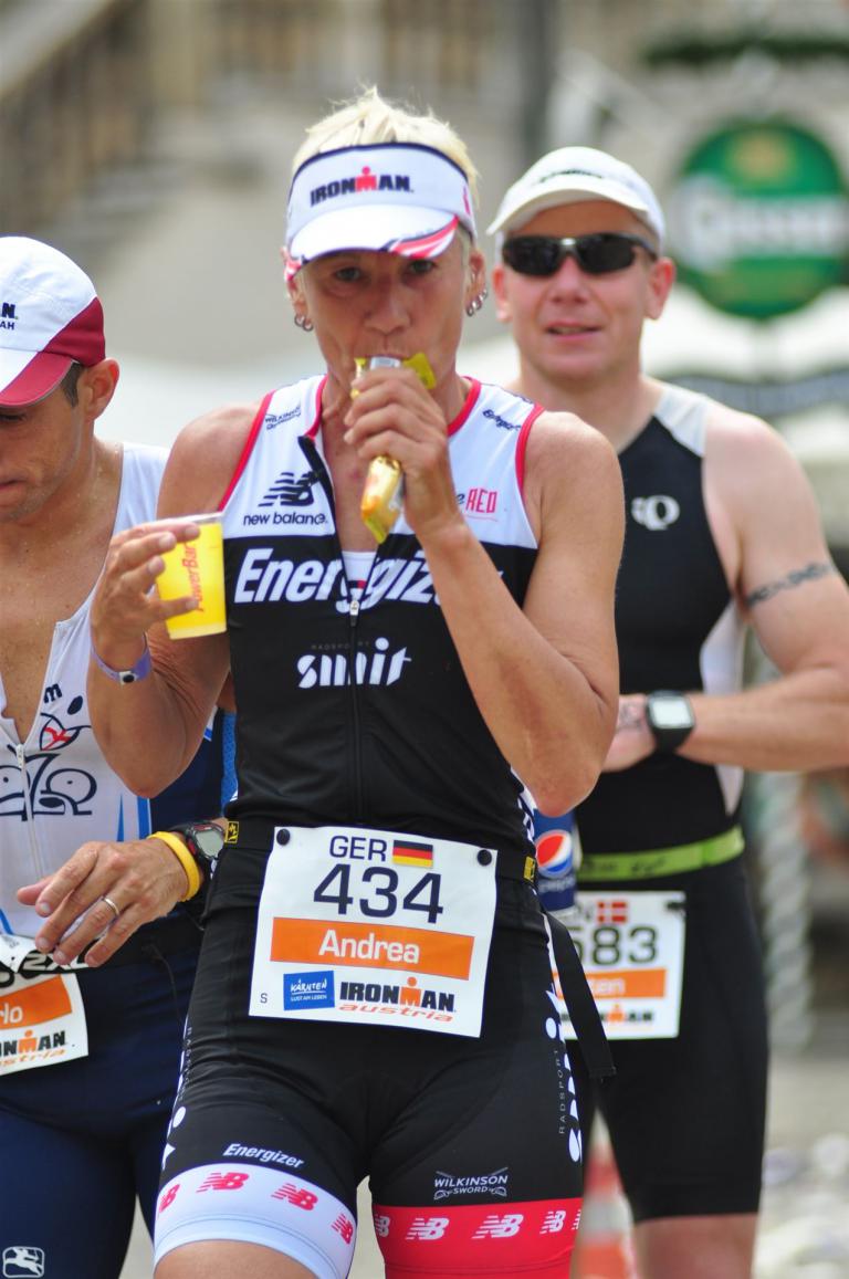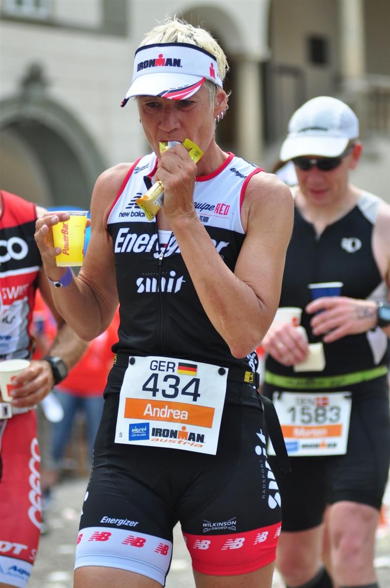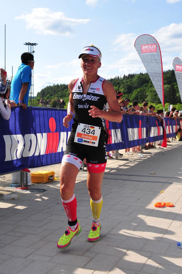 Das Wetter ist prima, die Temperatur liegt bei ca. 26 Grad im Schatten. Es werden 2 Runde á 21 km gelaufen. Von der Wechselzone geht es am Anfang entlang der Lende in Richtung Krumpendorf. In Krumpendorf läuft man eine kurze Strecke durchs Schwimmbad. Es ist schon etwas ungewöhnlich die Badegäste auf den Grünanlagen liegen zu sehen. Danach geht es entlang der Lende nach Klagenfurt Stadtmitte. Einmal um das Wahrzeichen, den Lindwurm herum und wieder zurück in Richtung Ziel. Die Strecke ist sehr abwechslungsreich, es stehen viele Freunde, Familie und Zuschauer an der Strecke. Aufgrund des Gegenverkehrs der anderen Läufer hat man immer etwas zu schauen. Das Anfeuern durch die Zuschauer puscht jeden Athleten. Die Schmerzen sind alle vergessen, man genießt die tolle Stimmung. Auf der 2. Runde habe ich leichte Probleme mit den Oberschenkeln und den Waden. Ich lasse mich davon jedoch nicht beirren, einfach nur weiterlaufen. Die Unterführung nach Klagenfurt sowie die Bordsteinkanten in der Stadtmitte bereiten mir etwas Probleme, aber egal, da macht man einfach etwas langsam.