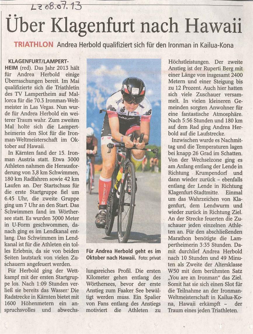 Das Wetter ist prima, die Temperatur liegt bei ca. 26 Grad im Schatten. Es werden 2 Runde á 21 km gelaufen. Von der Wechselzone geht es am Anfang entlang der Lende in Richtung Krumpendorf. In Krumpendorf läuft man eine kurze Strecke durchs Schwimmbad. Es ist schon etwas ungewöhnlich die Badegäste auf den Grünanlagen liegen zu sehen. Danach geht es entlang der Lende nach Klagenfurt Stadtmitte. Einmal um das Wahrzeichen, den Lindwurm herum und wieder zurück in Richtung Ziel. Die Strecke ist sehr abwechslungsreich, es stehen viele Freunde, Familie und Zuschauer an der Strecke. Aufgrund des Gegenverkehrs der anderen Läufer hat man immer etwas zu schauen. Das Anfeuern durch die Zuschauer puscht jeden Athleten. Die Schmerzen sind alle vergessen, man genießt die tolle Stimmung. Auf der 2. Runde habe ich leichte Probleme mit den Oberschenkeln und den Waden. Ich lasse mich davon jedoch nicht beirren, einfach nur weiterlaufen. Die Unterführung nach Klagenfurt sowie die Bordsteinkanten in der Stadtmitte bereiten mir etwas Probleme, aber egal, da macht man einfach etwas langsam.