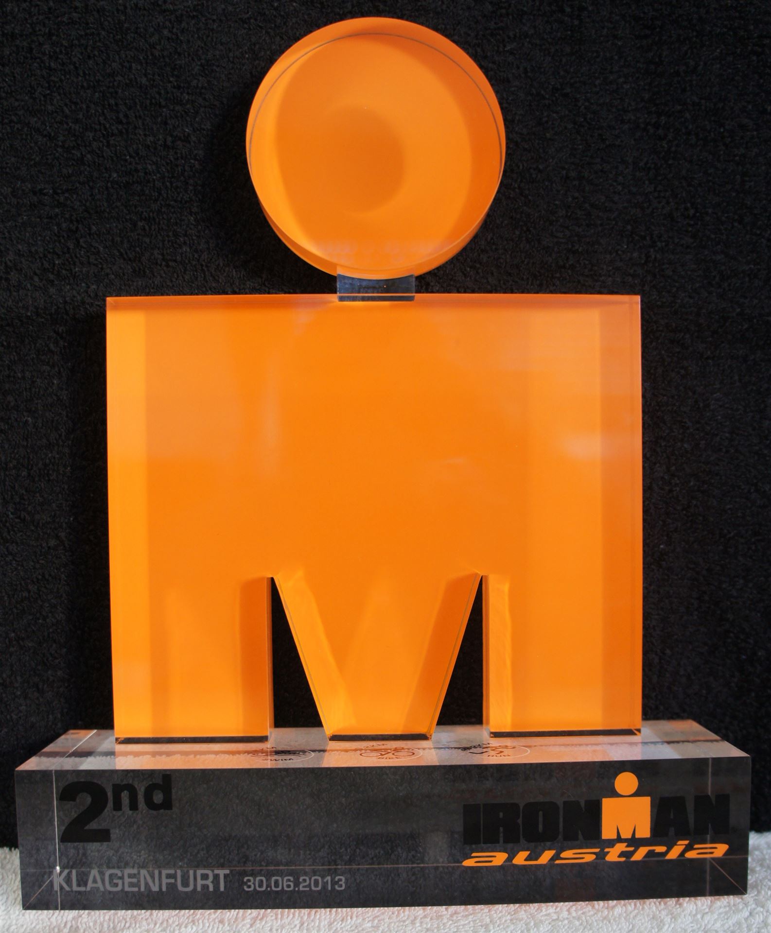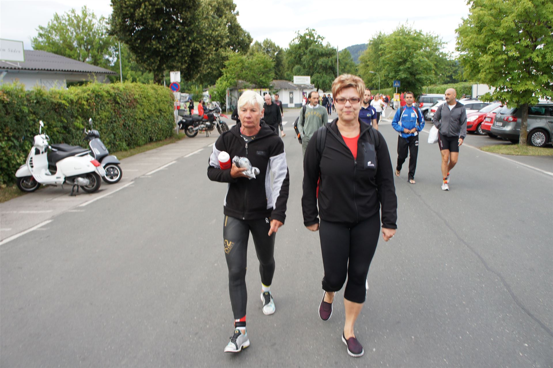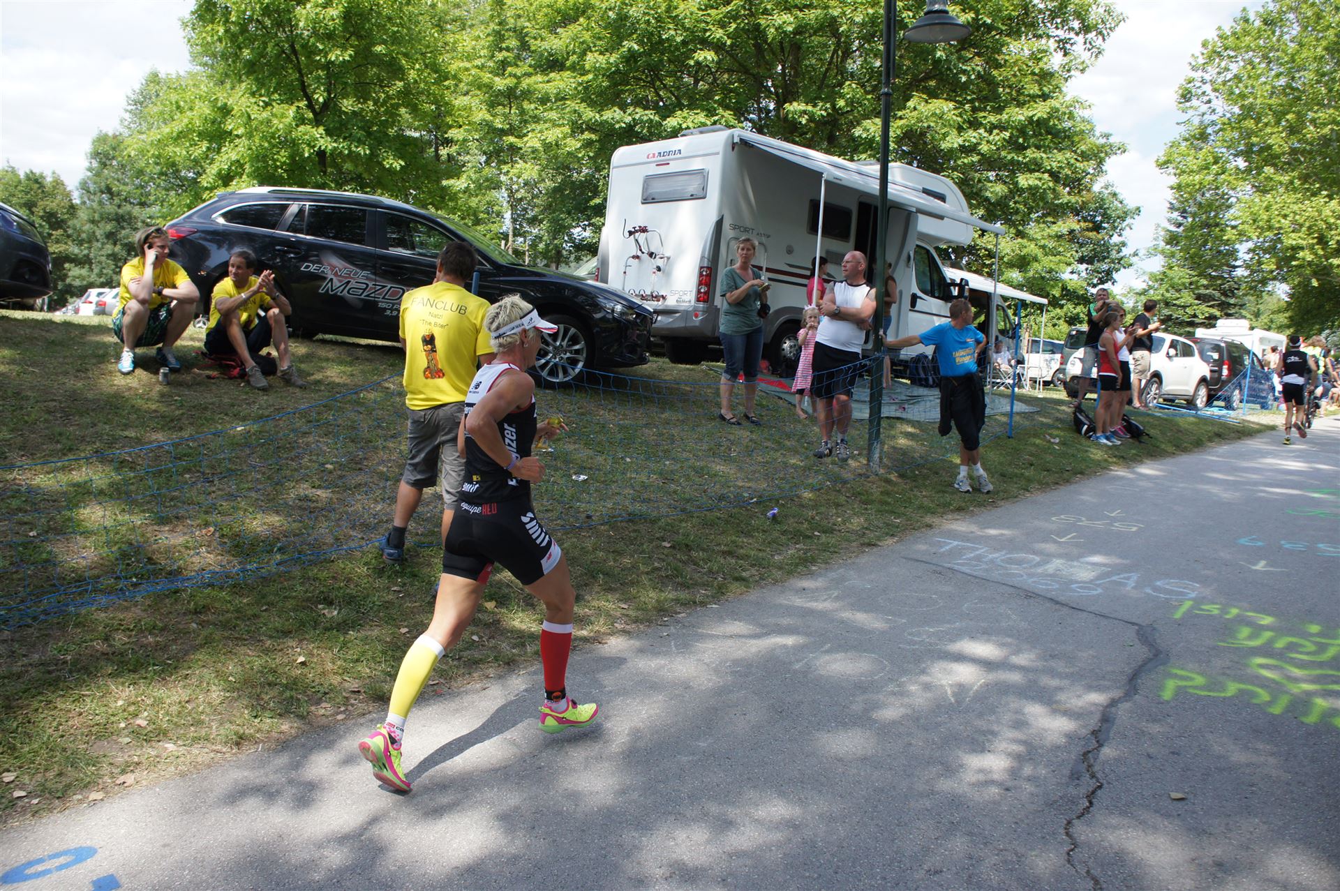Das Wetter ist prima, die Temperatur liegt bei ca. 26 Grad im Schatten. Es werden 2 Runde á 21 km gelaufen. Von der Wechselzone geht es am Anfang entlang der Lende in Richtung Krumpendorf. In Krumpendorf läuft man eine kurze Strecke durchs Schwimmbad. Es ist schon etwas ungewöhnlich die Badegäste auf den Grünanlagen liegen zu sehen. Danach geht es entlang der Lende nach Klagenfurt Stadtmitte. Einmal um das Wahrzeichen, den Lindwurm herum und wieder zurück in Richtung Ziel. Die Strecke ist sehr abwechslungsreich, es stehen viele Freunde, Familie und Zuschauer an der Strecke. Aufgrund des Gegenverkehrs der anderen Läufer hat man immer etwas zu schauen. Das Anfeuern durch die Zuschauer puscht jeden Athleten. Die Schmerzen sind alle vergessen, man genießt die tolle Stimmung. Auf der 2. Runde habe ich leichte Probleme mit den Oberschenkeln und den Waden. Ich lasse mich davon jedoch nicht beirren, einfach nur weiterlaufen. Die Unterführung nach Klagenfurt sowie die Bordsteinkanten in der Stadtmitte bereiten mir etwas Probleme, aber egal, da macht man einfach etwas langsam.