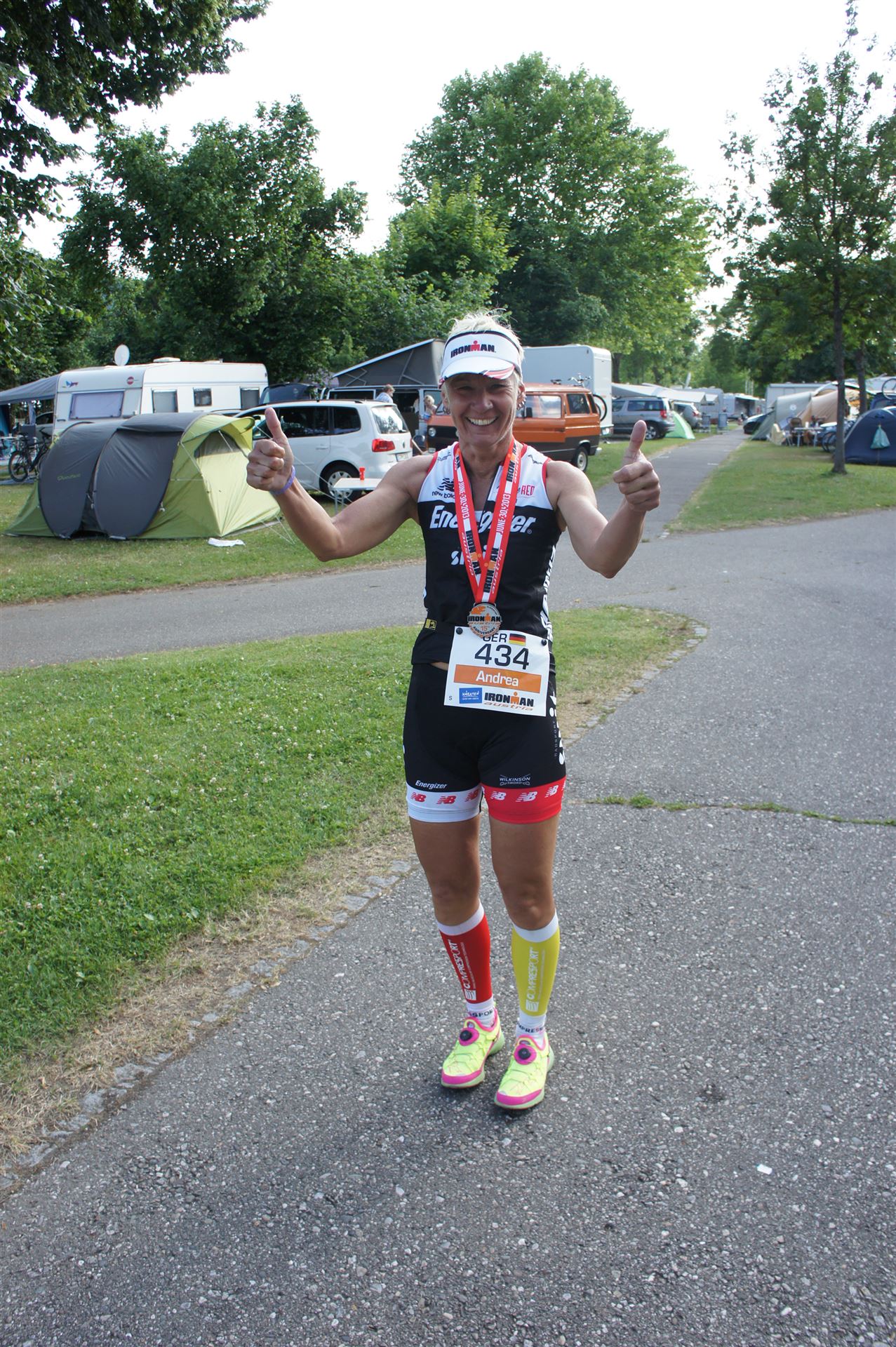 Ich bin geduscht, etwas essen kann ich an diesem Tag nichts mehr. Mein Rad sowie meine übrige Kleidung habe ich bereits aus der Wechselzone geholt. Es geht wieder zurück an die Finisherline. Die Stimmung ist gigantisch. Jeder einzelne Athlet wird von den Moderatoren und vom Publikum begrüßt. Der Zieleinlauf ist bis 00:00 Uhr geöffnet, danach gibt es noch ein Feuerwerk.