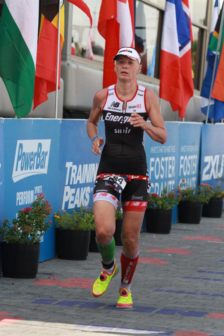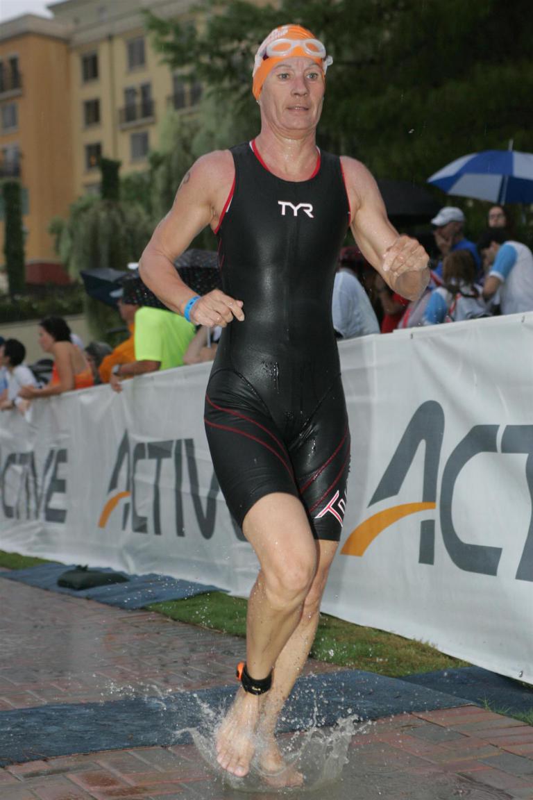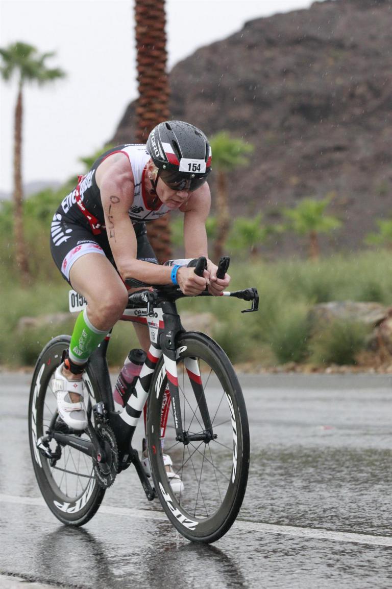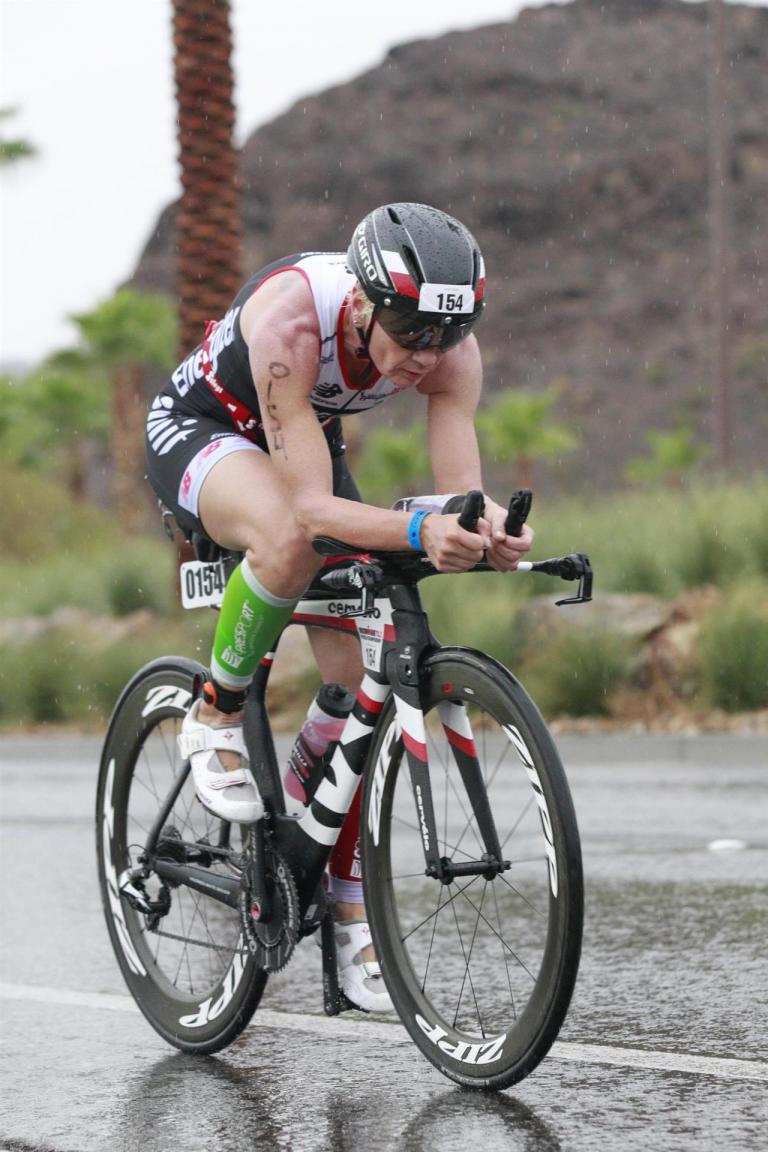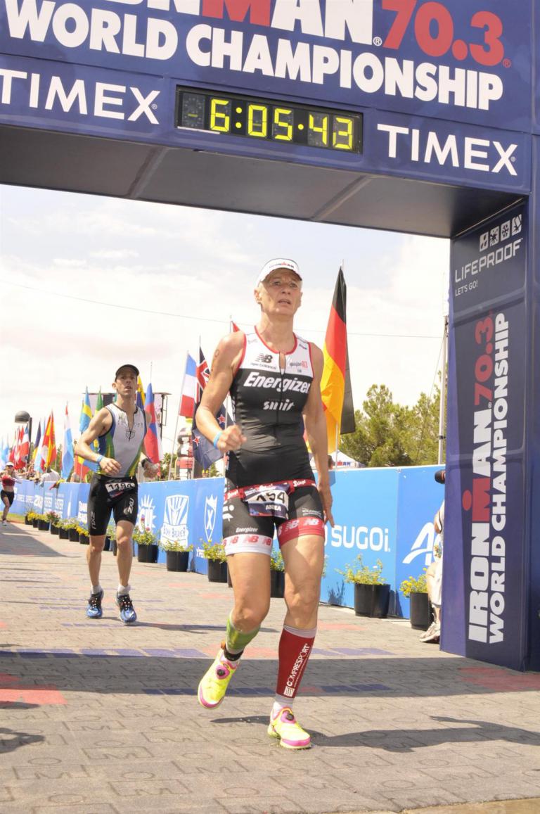 Um 6.30 Uhr gehen dann die männlichen Pros an den Start. 4 Minuten später die Profi-Frauen. Die nächste Startgruppe sind die Frauen 50+, also meine Startgruppe. Pünktlich um 6.38 Uhr fällt der Startschuss. Das Wasser ist total braun von Sand und Schlamm, man kann die Hand nicht vor den Augen sehen. Die Schwimmstrecke ist relativ einfach. Einfach einmal in eine Richtung und wieder zurück. Vom Schwimmausstieg bis zur Radwechselzone ist ein langer Weg. Das Schwimmen war okay für mich, wobei ich etwas erstaunt über meine relativ schlechte Zeit bin. Nach einigen Gesprächen mit anderen Athleten zeigt sich, dass viele auch länger geschwommen sind. Evtl. war die Strecke etwas länger, aber egal, jeder musste ja die gleiche Strecke zurücklegen. In der Wechselzone schnell die Radbekleidung an und in Richtung Ausgang. Der Weg auf die Radstrecke ist auch etwas anders. Es geht ein kleiner schmaler Weg steil nach oben. Da ich bereits meine Radschuhe anhabe ist das relativ mühsam. Meine Waden "explodieren" fast. Auf dem Rad habe ich teilweise Probleme mit den Waden. Es schüttet weiterhin furchtbar, man kann froh sein, dass es wenigstens warm ist. Zuerst fahren wir ein Quadrat und danach geht es in Richtung Wüste in den Nationalpark. Teilweise sind riesige Pfützen auf der Strasse. Es regnet weiterhin Bindfäden, ich bin etwas vorsichtig bei diesem Wetter. Die Radstrecke ist nicht komplett gesperrt, teilweise fahren Autos, für eine Weltmeisterschaft doch sehr ungewöhnlich. Die Strecke ist wellig, es sind lediglich kleine Hügel, keine richtigen Berge. Diese kurzen Steigungen sind jedoch nicht ohne. Ich fahre mein Tempo und mache mich nicht verrückt. Inzwischen hat man sich an den Regen gewöhnt, die Füße sind etwas kalt, bei den Abfahrten ist es teilweise etwas frisch. Nach ca. 70 Kilometern klart es auf, der Regen hört endlich auf. Die letzten 20 Kilometer gehen in Richtung Las Vegas nach Henderson. In der 2. Wechselzone bekommt man das Rad abgenommen und den Runbeutel gereicht. Schnell ins Wechselzelt umziehen und auf die Laufstrecke. Insgesamt müssen 3 Runden mit jeweils 50 Höhenmeter gelaufen werden, also insgesamt 150 Höhenmeter. Am Anfang geht es ca. 1 bis 1,5 km leicht nach unten, diese Strecke muss man auch wieder hoch laufen. Anschließend geht es an der Wechselzone vorbei und dann kommt ein langer Anstieg. Auf der ersten Runde habe ich ganz schön Probleme mit dieser Steigung. Es fällt mir sehr schwer und ich denke schon darüber nach, wie ich diese Strecke 3 Runden überlebe. Zurück geht es dann angenehm nach unten und meinen Beinen geht es etwas besser. Inzwischen ist auch die Sonne raus gekommen, es ist jetzt deutlich wärmer. Die Versorgung auf der Laufstrecke ist sehr gut. Es gibt ausreichend Wasser zur Kühlung sowie Iso und Cola. Ich bin froh als ich die letzte Runde vor mir habe. Es ist immer wieder erstaunlich, dass man dann doch alles schafft. Auf der ersten Runde hatte ich noch meine Zweifel, aber irgendwie funktioniert das doch. Ich bin froh als ich endlich das Ziel durchlaufen kann. Es geht mir sehr gut, meine Zeit und Platzierung sind mir in diesem Moment völlig egal. Ich habe gefinisht und bin glücklich und zufrieden.