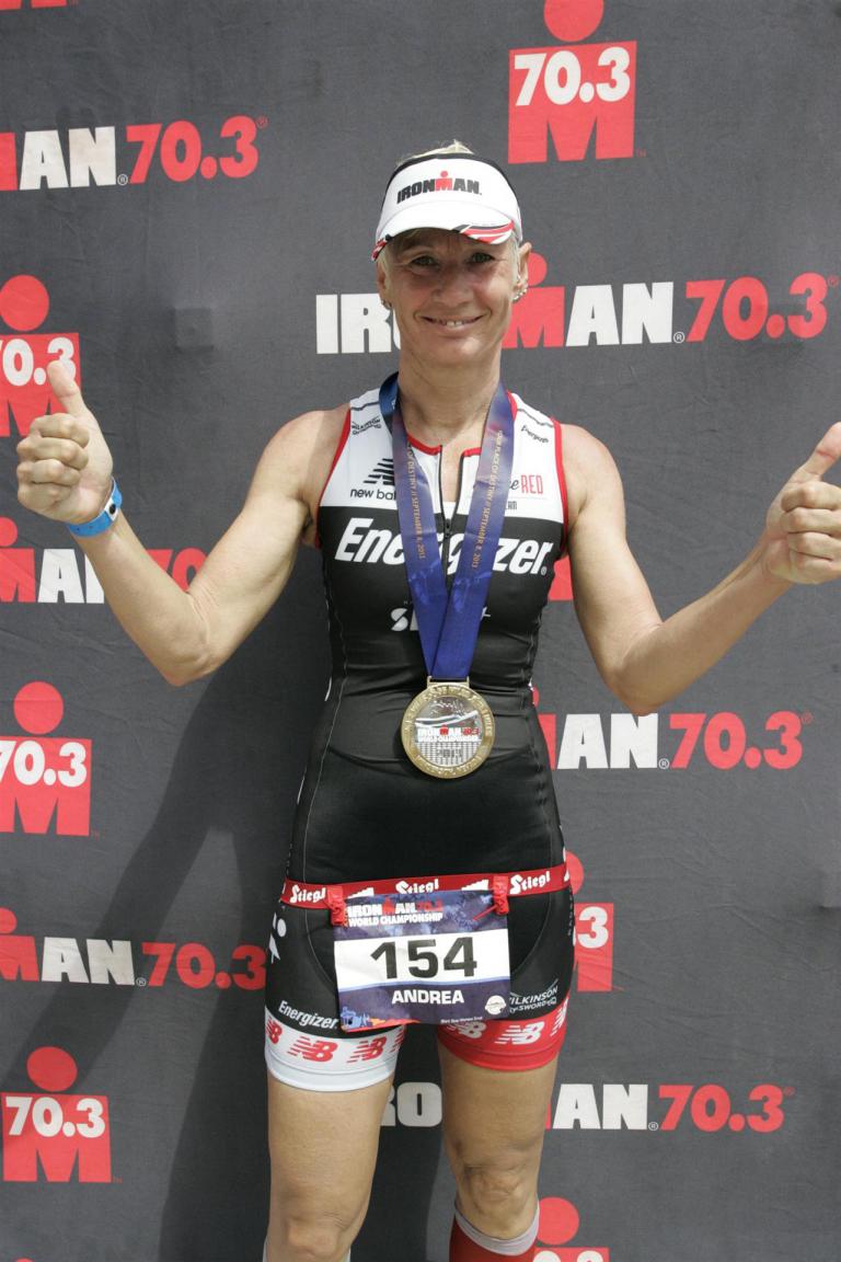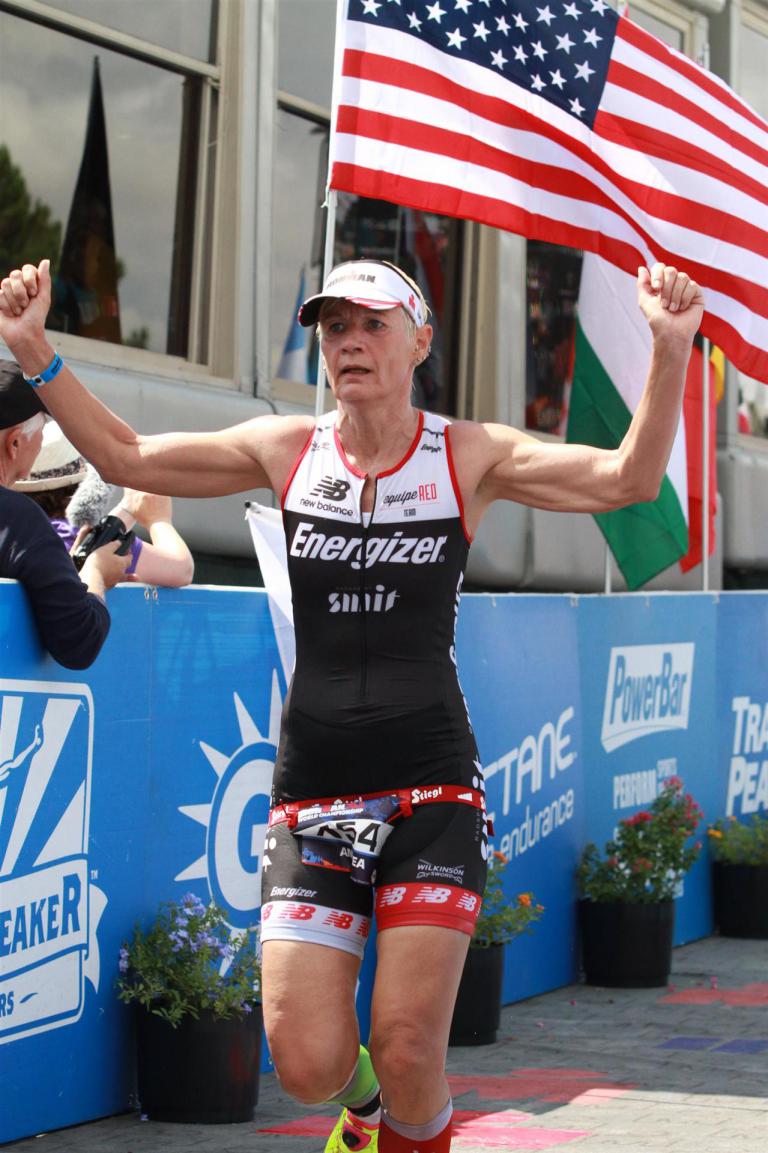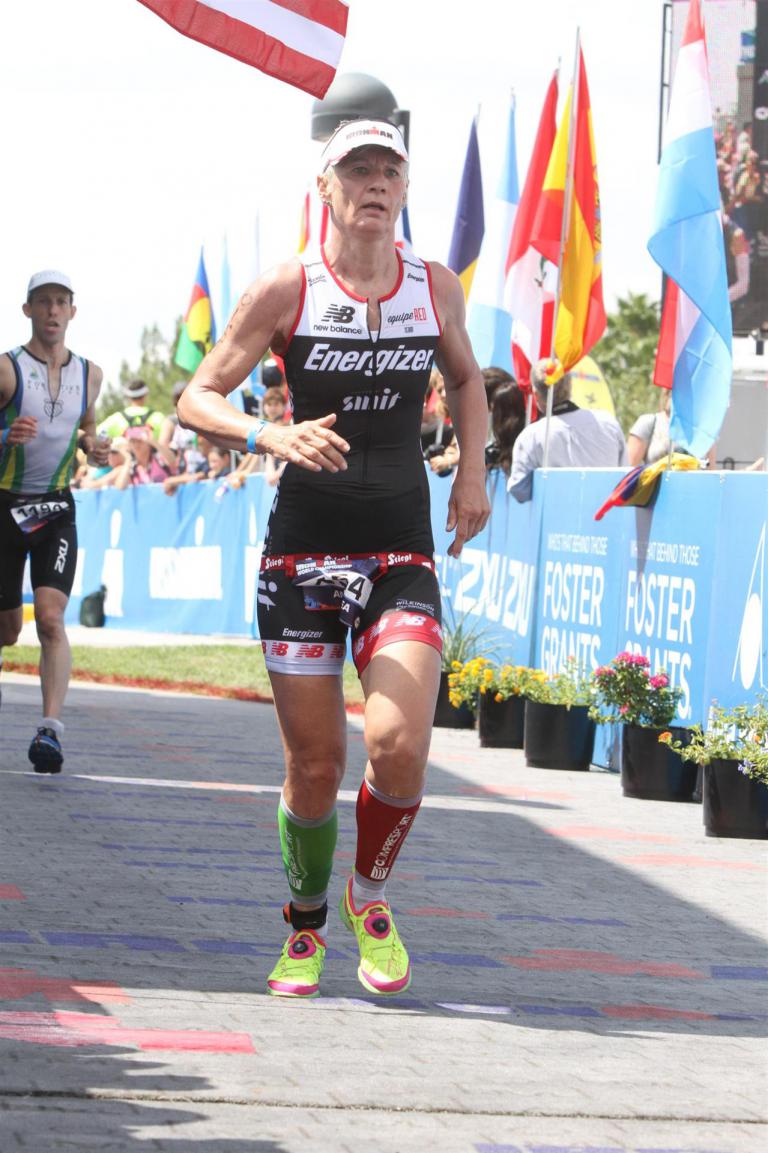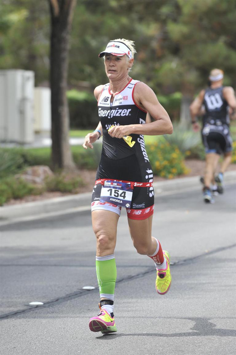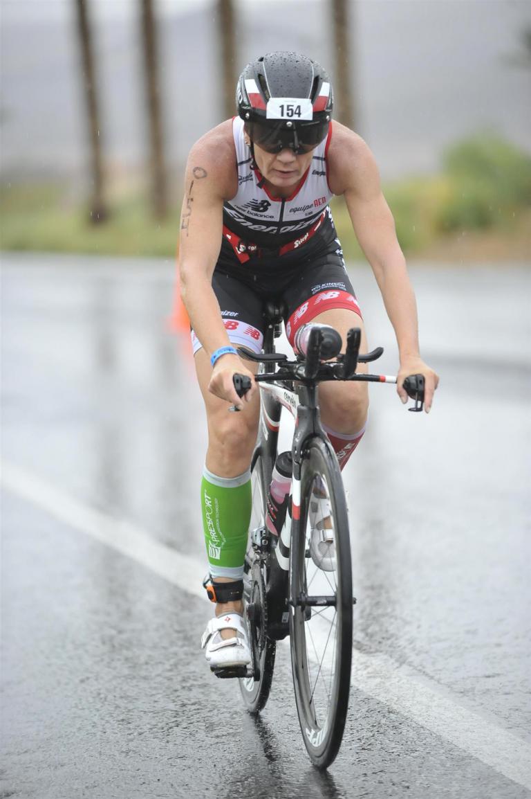Um 6.30 Uhr gehen dann die männlichen Pros an den Start. 4 Minuten später die Profi-Frauen. Die nächste Startgruppe sind die Frauen 50+, also meine Startgruppe. Pünktlich um 6.38 Uhr fällt der Startschuss. Das Wasser ist total braun von Sand und Schlamm, man kann die Hand nicht vor den Augen sehen. Die Schwimmstrecke ist relativ einfach. Einfach einmal in eine Richtung und wieder zurück. Vom Schwimmausstieg bis zur Radwechselzone ist ein langer Weg. Das Schwimmen war okay für mich, wobei ich etwas erstaunt über meine relativ schlechte Zeit bin. Nach einigen Gesprächen mit anderen Athleten zeigt sich, dass viele auch länger geschwommen sind. Evtl. war die Strecke etwas länger, aber egal, jeder musste ja die gleiche Strecke zurücklegen. In der Wechselzone schnell die Radbekleidung an und in Richtung Ausgang. Der Weg auf die Radstrecke ist auch etwas anders. Es geht ein kleiner schmaler Weg steil nach oben. Da ich bereits meine Radschuhe anhabe ist das relativ mühsam. Meine Waden "explodieren" fast. Auf dem Rad habe ich teilweise Probleme mit den Waden. Es schüttet weiterhin furchtbar, man kann froh sein, dass es wenigstens warm ist. Zuerst fahren wir ein Quadrat und danach geht es in Richtung Wüste in den Nationalpark. Teilweise sind riesige Pfützen auf der Strasse. Es regnet weiterhin Bindfäden, ich bin etwas vorsichtig bei diesem Wetter. Die Radstrecke ist nicht komplett gesperrt, teilweise fahren Autos, für eine Weltmeisterschaft doch sehr ungewöhnlich. Die Strecke ist wellig, es sind lediglich kleine Hügel, keine richtigen Berge. Diese kurzen Steigungen sind jedoch nicht ohne. Ich fahre mein Tempo und mache mich nicht verrückt. Inzwischen hat man sich an den Regen gewöhnt, die Füße sind etwas kalt, bei den Abfahrten ist es teilweise etwas frisch. Nach ca. 70 Kilometern klart es auf, der Regen hört endlich auf. Die letzten 20 Kilometer gehen in Richtung Las Vegas nach Henderson. In der 2. Wechselzone bekommt man das Rad abgenommen und den Runbeutel gereicht. Schnell ins Wechselzelt umziehen und auf die Laufstrecke. Insgesamt müssen 3 Runden mit jeweils 50 Höhenmeter gelaufen werden, also insgesamt 150 Höhenmeter. Am Anfang geht es ca. 1 bis 1,5 km leicht nach unten, diese Strecke muss man auch wieder hoch laufen. Anschließend geht es an der Wechselzone vorbei und dann kommt ein langer Anstieg. Auf der ersten Runde habe ich ganz schön Probleme mit dieser Steigung. Es fällt mir sehr schwer und ich denke schon darüber nach, wie ich diese Strecke 3 Runden überlebe. Zurück geht es dann angenehm nach unten und meinen Beinen geht es etwas besser. Inzwischen ist auch die Sonne raus gekommen, es ist jetzt deutlich wärmer. Die Versorgung auf der Laufstrecke ist sehr gut. Es gibt ausreichend Wasser zur Kühlung sowie Iso und Cola. Ich bin froh als ich die letzte Runde vor mir habe. Es ist immer wieder erstaunlich, dass man dann doch alles schafft. Auf der ersten Runde hatte ich noch meine Zweifel, aber irgendwie funktioniert das doch. Ich bin froh als ich endlich das Ziel durchlaufen kann. Es geht mir sehr gut, meine Zeit und Platzierung sind mir in diesem Moment völlig egal. Ich habe gefinisht und bin glücklich und zufrieden.