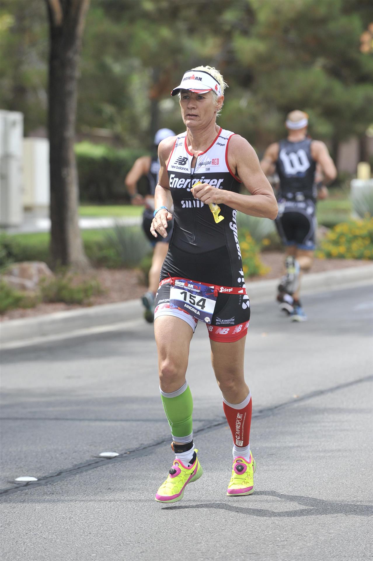Um 6.30 Uhr gehen dann die männlichen Pros an den Start. 4 Minuten später die Profi-Frauen. Die nächste Startgruppe sind die Frauen 50+, also meine Startgruppe. Pünktlich um 6.38 Uhr fällt der Startschuss. Das Wasser ist total braun von Sand und Schlamm, man kann die Hand nicht vor den Augen sehen. Die Schwimmstrecke ist relativ einfach. Einfach einmal in eine Richtung und wieder zurück. Vom Schwimmausstieg bis zur Radwechselzone ist ein langer Weg. Das Schwimmen war okay für mich, wobei ich etwas erstaunt über meine relativ schlechte Zeit bin. Nach einigen Gesprächen mit anderen Athleten zeigt sich, dass viele auch länger geschwommen sind. Evtl. war die Strecke etwas länger, aber egal, jeder musste ja die gleiche Strecke zurücklegen. In der Wechselzone schnell die Radbekleidung an und in Richtung Ausgang. Der Weg auf die Radstrecke ist auch etwas anders. Es geht ein kleiner schmaler Weg steil nach oben. Da ich bereits meine Radschuhe anhabe ist das relativ mühsam. Meine Waden "explodieren" fast. Auf dem Rad habe ich teilweise Probleme mit den Waden. Es schüttet weiterhin furchtbar, man kann froh sein, dass es wenigstens warm ist. Zuerst fahren wir ein Quadrat und danach geht es in Richtung Wüste in den Nationalpark. Teilweise sind riesige Pfützen auf der Strasse. Es regnet weiterhin Bindfäden, ich bin etwas vorsichtig bei diesem Wetter. Die Radstrecke ist nicht komplett gesperrt, teilweise fahren Autos, für eine Weltmeisterschaft doch sehr ungewöhnlich. Die Strecke ist wellig, es sind lediglich kleine Hügel, keine richtigen Berge. Diese kurzen Steigungen sind jedoch nicht ohne. Ich fahre mein Tempo und mache mich nicht verrückt. Inzwischen hat man sich an den Regen gewöhnt, die Füße sind etwas kalt, bei den Abfahrten ist es teilweise etwas frisch. Nach ca. 70 Kilometern klart es auf, der Regen hört endlich auf. Die letzten 20 Kilometer gehen in Richtung Las Vegas nach Henderson. In der 2. Wechselzone bekommt man das Rad abgenommen und den Runbeutel gereicht. Schnell ins Wechselzelt umziehen und auf die Laufstrecke. Insgesamt müssen 3 Runden mit jeweils 50 Höhenmeter gelaufen werden, also insgesamt 150 Höhenmeter. Am Anfang geht es ca. 1 bis 1,5 km leicht nach unten, diese Strecke muss man auch wieder hoch laufen. Anschließend geht es an der Wechselzone vorbei und dann kommt ein langer Anstieg. Auf der ersten Runde habe ich ganz schön Probleme mit dieser Steigung. Es fällt mir sehr schwer und ich denke schon darüber nach, wie ich diese Strecke 3 Runden überlebe. Zurück geht es dann angenehm nach unten und meinen Beinen geht es etwas besser. Inzwischen ist auch die Sonne raus gekommen, es ist jetzt deutlich wärmer. Die Versorgung auf der Laufstrecke ist sehr gut. Es gibt ausreichend Wasser zur Kühlung sowie Iso und Cola. Ich bin froh als ich die letzte Runde vor mir habe. Es ist immer wieder erstaunlich, dass man dann doch alles schafft. Auf der ersten Runde hatte ich noch meine Zweifel, aber irgendwie funktioniert das doch. Ich bin froh als ich endlich das Ziel durchlaufen kann. Es geht mir sehr gut, meine Zeit und Platzierung sind mir in diesem Moment völlig egal. Ich habe gefinisht und bin glücklich und zufrieden.