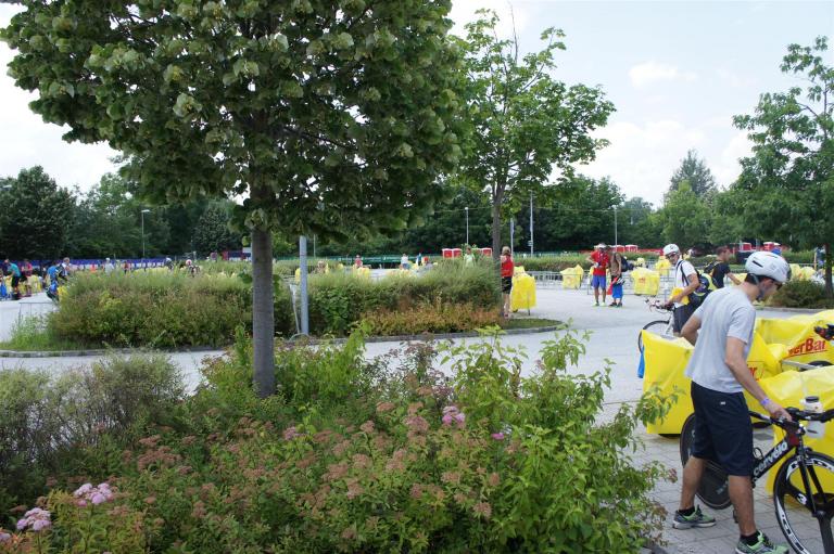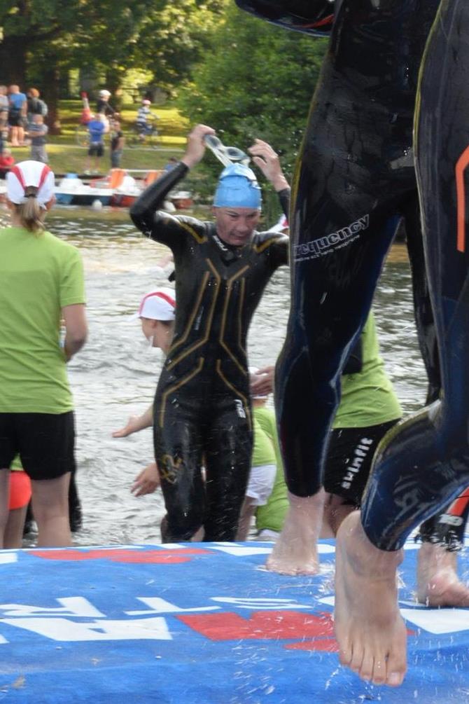 Nach einer Schwimmzeit von 1 Stunde und 11 Minuten verlasse ich das Wasser. Ich bin zufrieden mit meiner Zeit. Der Weg vom Schwimmausstieg bis in die Wechselzone ist relativ lange. Man hat ausreichend Zeit den Neoprenanzug etwas auszuziehen.