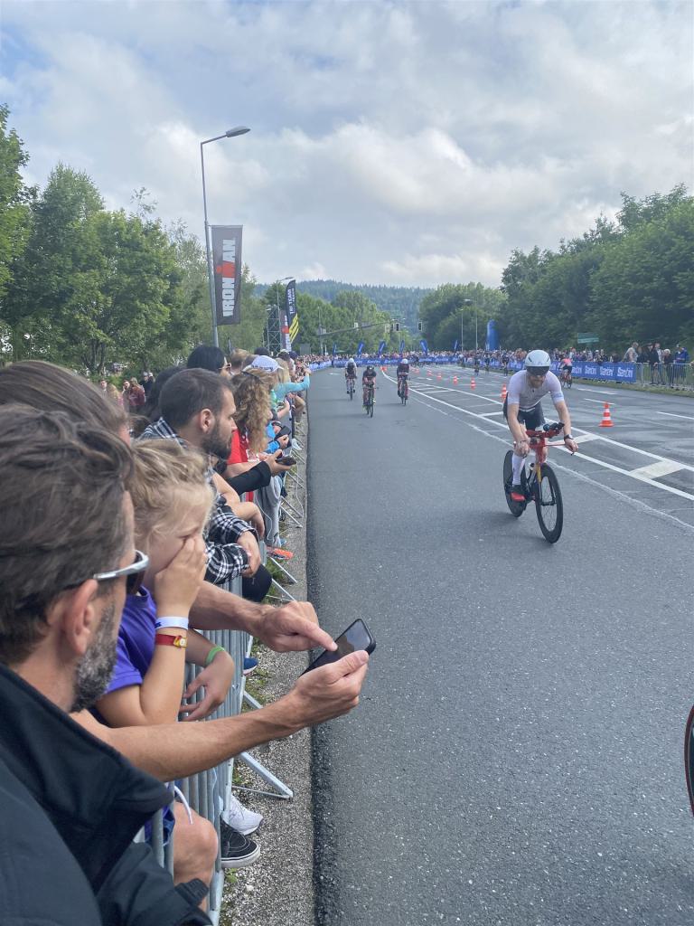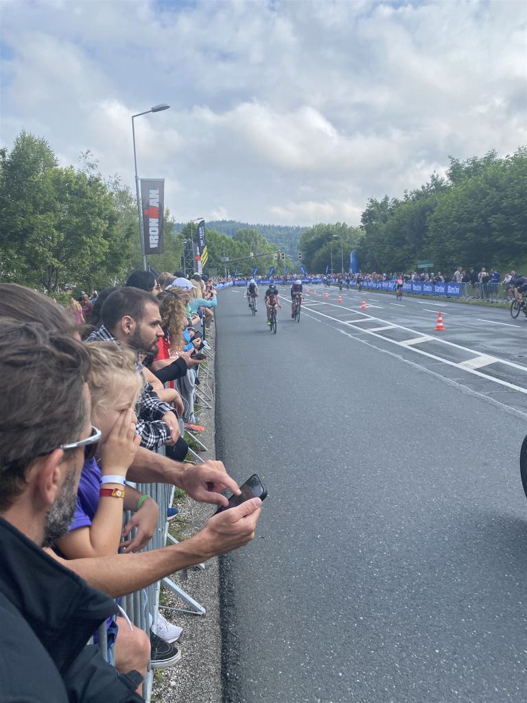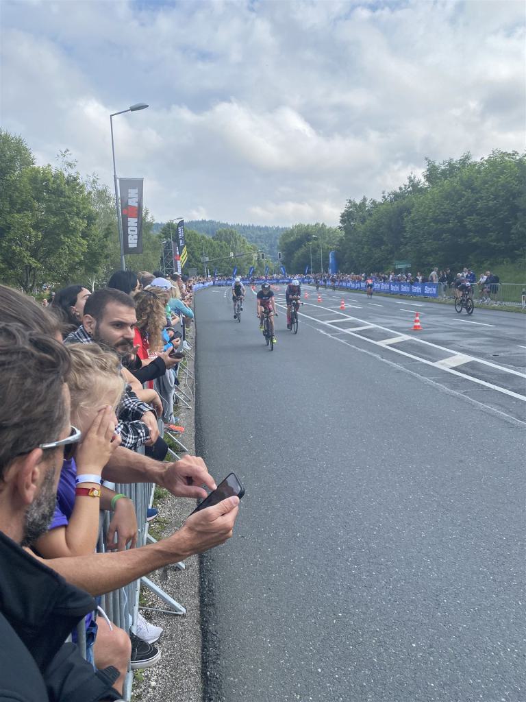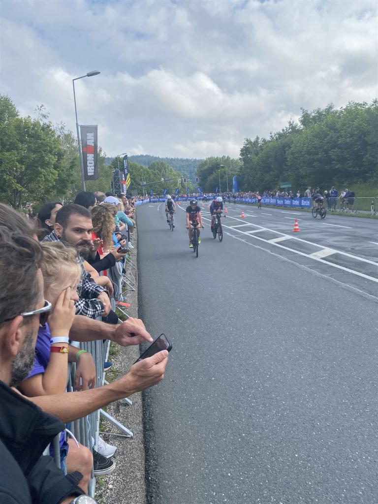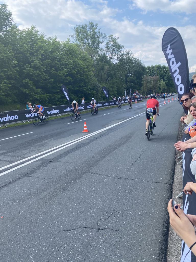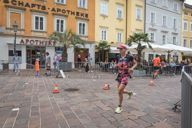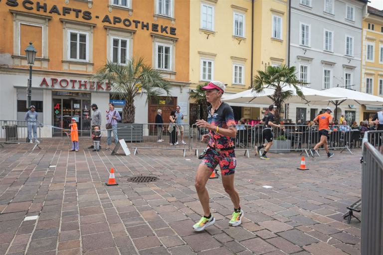Aufgrund der für meine Verhältnisse niedrigen Temperaturen ziehe ich Socken mit klassischen Rennradschuhen sowie ein Trikot über. Das war die beste Entscheidung. Das erste Stück der Radstrecke führt am Wörthersee entlang. Die Straßen sind noch nass vom Regen, dafür ist die Aussicht traumhaft. Es lässt sich relativ gut fahren, durch den Rolling-Start ist das Feld nicht so dicht. Selbstverständlich muss man schauen, dass man keinen Windschatten fährt, es klappt aber ganz gut. Der erste längere Anstieg ist der Faaker See. Aufgrund der Wetterverhältnisse sind nicht viele Zuschauer am Anstieg. Ich kurble den Anstieg im kleinen Gang hoch, ist kein Problem für mich. Danach kommt ein flaches Stück, da gibt es immer relativ viel Gegenwind. Ich fühle mich sehr gut auf dem Rad, habe Druck auf den Pedalen und kann den Wettkampf genießen. Die Wettervorhersage passt leider nicht ganz zum tatsächlichen Wetter. Es gibt Strecken mit Starkregen, die Straßen sind sehr nass, bei den Abfahrten muss man aufpassen. Den zweiten längeren Anstieg (Ruperti Berg) fahre ich auch ohne Probleme, bei den Abfahrten muss man aufpassen. Der 180 Kilometerkurs besteht aus 2 Runden. Die Anstiege müssen zweimal gefahren werden. Auf der zweiten Runde sind die Steigungen dann doch etwas schwerer. Insgesamt bin ich mit meiner Radzeit von 6:01:37 Stunden sehr zu frieden.