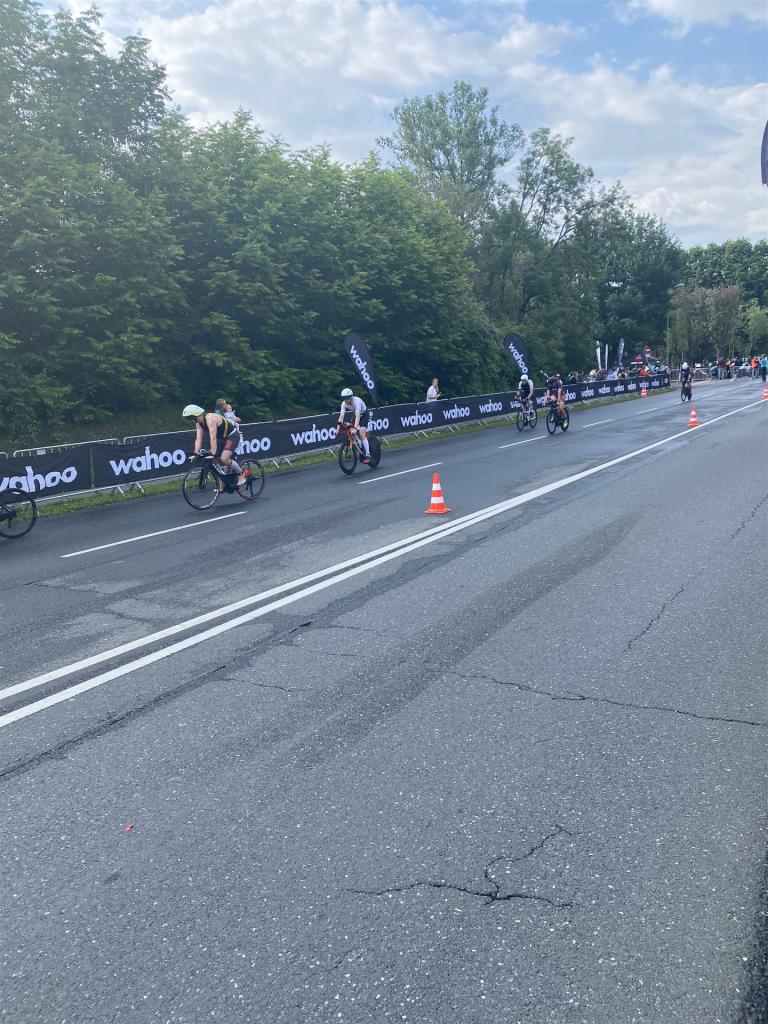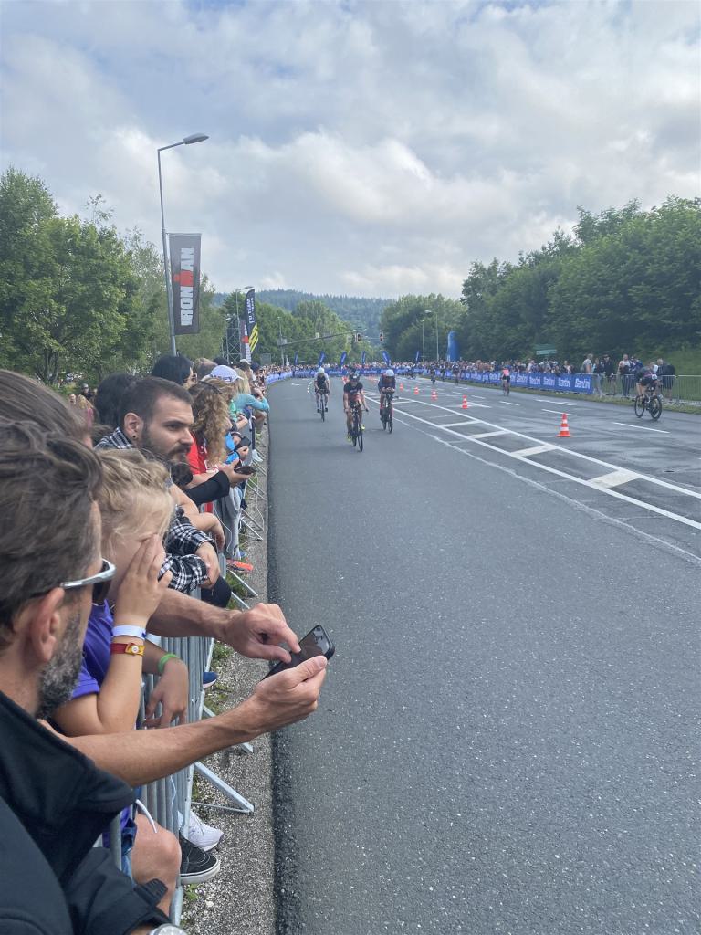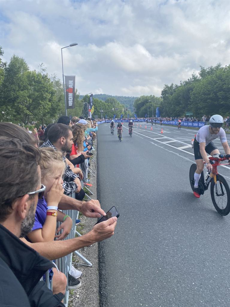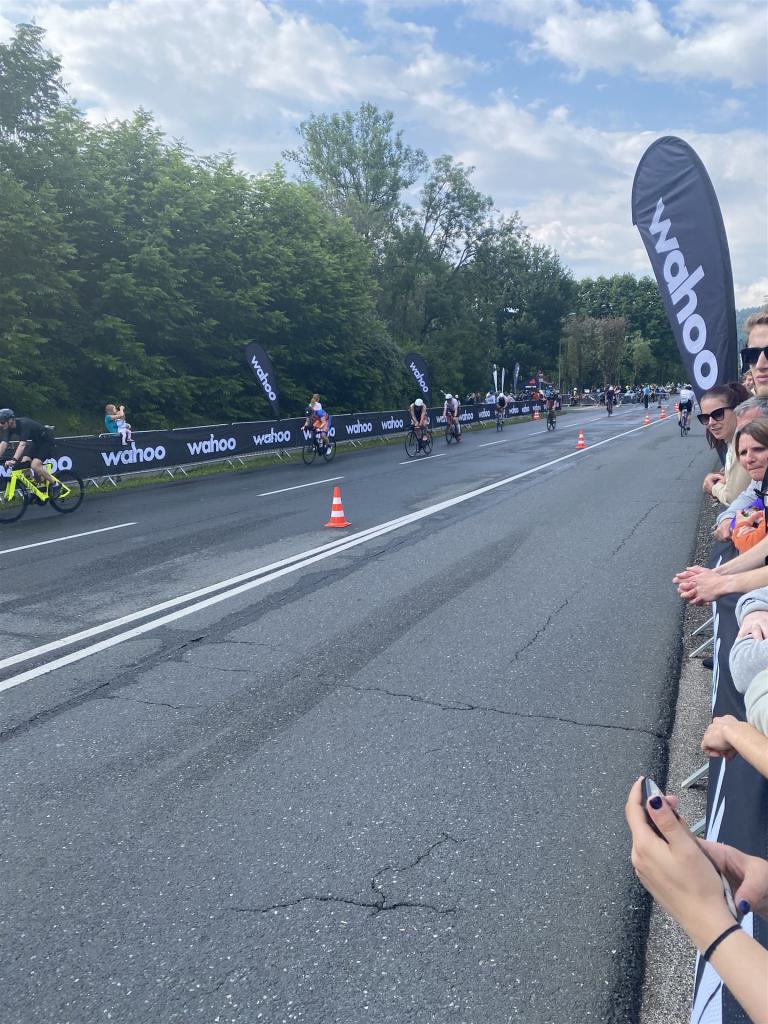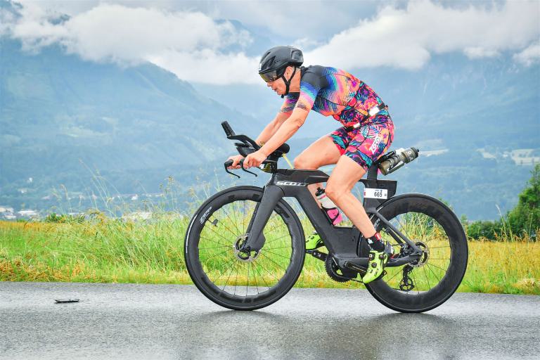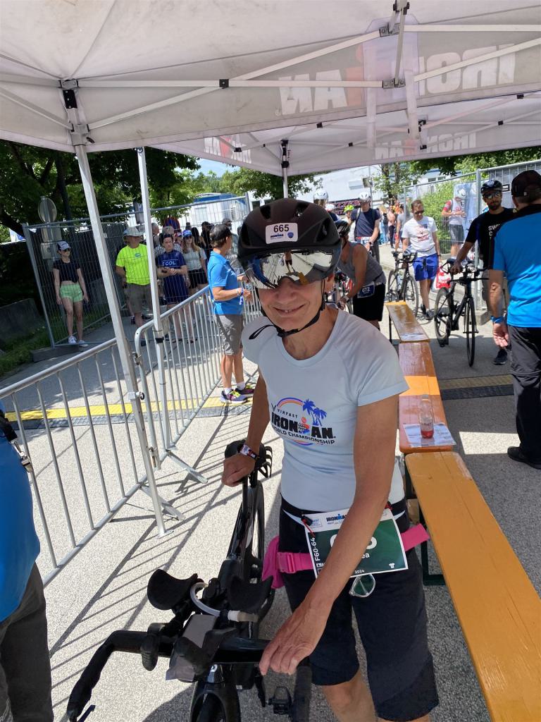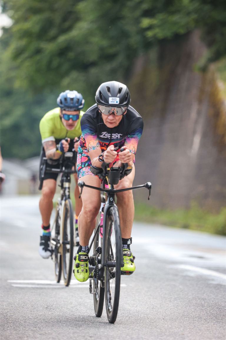 Aufgrund der für meine Verhältnisse niedrigen Temperaturen ziehe ich Socken mit klassischen Rennradschuhen sowie ein Trikot über. Das war die beste Entscheidung. Das erste Stück der Radstrecke führt am Wörthersee entlang. Die Straßen sind noch nass vom Regen, dafür ist die Aussicht traumhaft. Es lässt sich relativ gut fahren, durch den Rolling-Start ist das Feld nicht so dicht. Selbstverständlich muss man schauen, dass man keinen Windschatten fährt, es klappt aber ganz gut. Der erste längere Anstieg ist der Faaker See. Aufgrund der Wetterverhältnisse sind nicht viele Zuschauer am Anstieg. Ich kurble den Anstieg im kleinen Gang hoch, ist kein Problem für mich. Danach kommt ein flaches Stück, da gibt es immer relativ viel Gegenwind. Ich fühle mich sehr gut auf dem Rad, habe Druck auf den Pedalen und kann den Wettkampf genießen. Die Wettervorhersage passt leider nicht ganz zum tatsächlichen Wetter. Es gibt Strecken mit Starkregen, die Straßen sind sehr nass, bei den Abfahrten muss man aufpassen. Den zweiten längeren Anstieg (Ruperti Berg) fahre ich auch ohne Probleme, bei den Abfahrten muss man aufpassen. Der 180 Kilometerkurs besteht aus 2 Runden. Die Anstiege müssen zweimal gefahren werden. Auf der zweiten Runde sind die Steigungen dann doch etwas schwerer. Insgesamt bin ich mit meiner Radzeit von 6:01:37 Stunden sehr zu frieden.