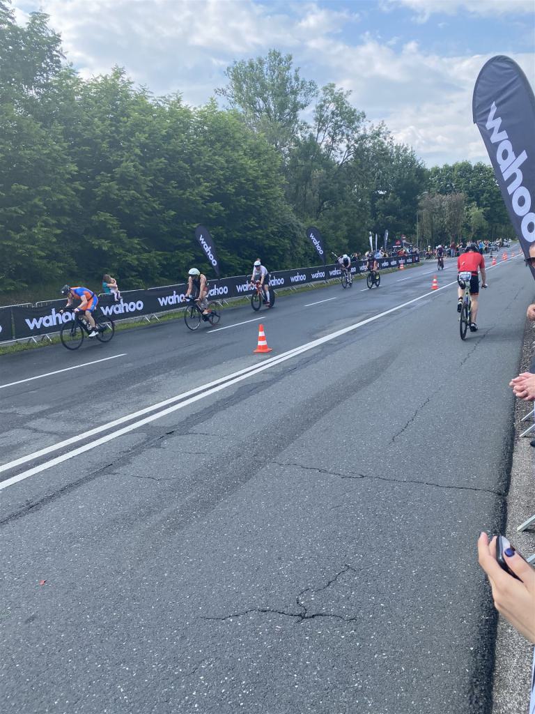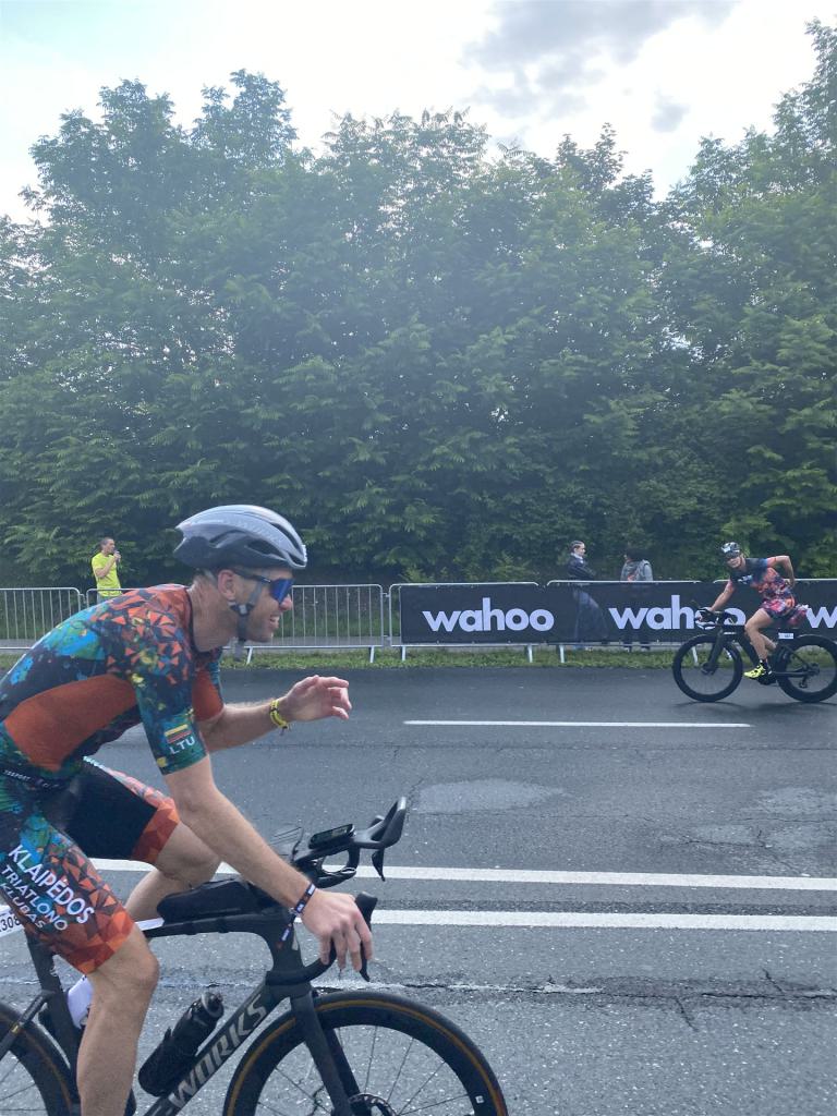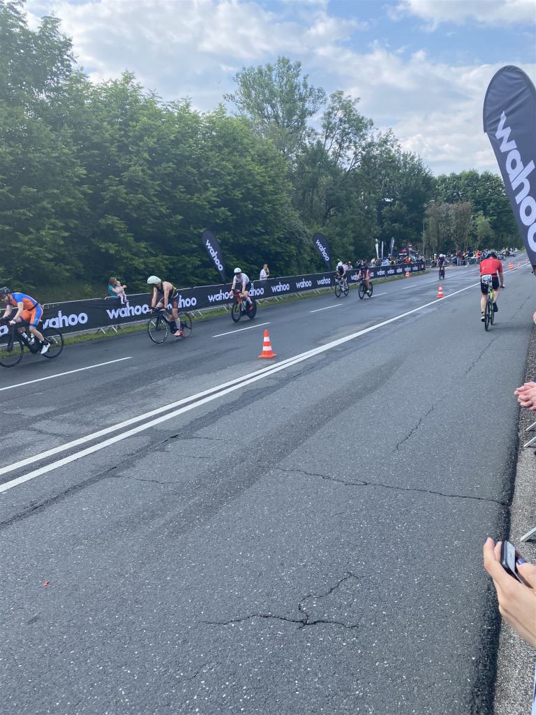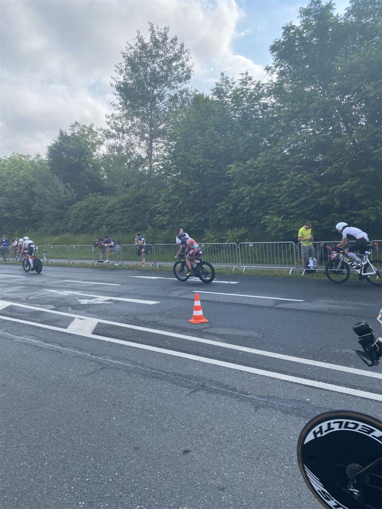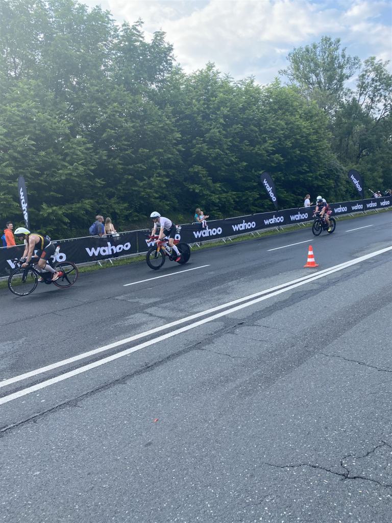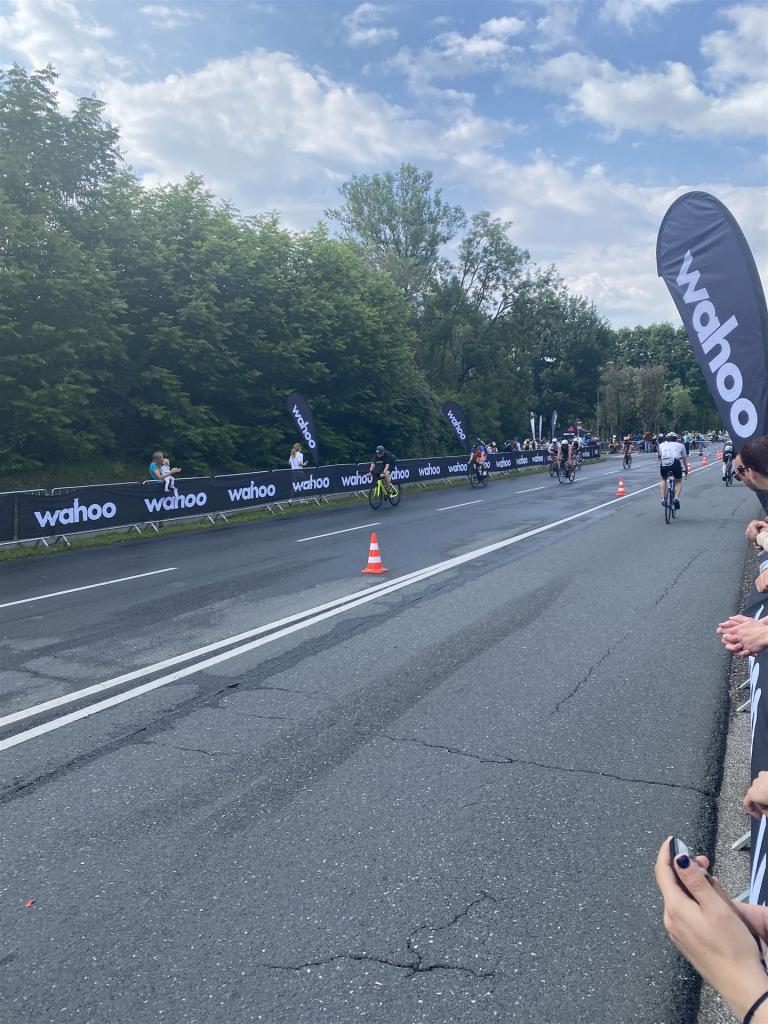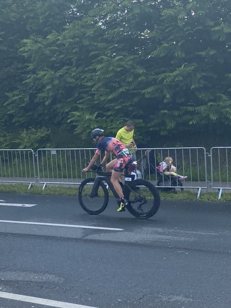 Aufgrund der für meine Verhältnisse niedrigen Temperaturen ziehe ich Socken mit klassischen Rennradschuhen sowie ein Trikot über. Das war die beste Entscheidung. Das erste Stück der Radstrecke führt am Wörthersee entlang. Die Straßen sind noch nass vom Regen, dafür ist die Aussicht traumhaft. Es lässt sich relativ gut fahren, durch den Rolling-Start ist das Feld nicht so dicht. Selbstverständlich muss man schauen, dass man keinen Windschatten fährt, es klappt aber ganz gut. Der erste längere Anstieg ist der Faaker See. Aufgrund der Wetterverhältnisse sind nicht viele Zuschauer am Anstieg. Ich kurble den Anstieg im kleinen Gang hoch, ist kein Problem für mich. Danach kommt ein flaches Stück, da gibt es immer relativ viel Gegenwind. Ich fühle mich sehr gut auf dem Rad, habe Druck auf den Pedalen und kann den Wettkampf genießen. Die Wettervorhersage passt leider nicht ganz zum tatsächlichen Wetter. Es gibt Strecken mit Starkregen, die Straßen sind sehr nass, bei den Abfahrten muss man aufpassen. Den zweiten längeren Anstieg (Ruperti Berg) fahre ich auch ohne Probleme, bei den Abfahrten muss man aufpassen. Der 180 Kilometerkurs besteht aus 2 Runden. Die Anstiege müssen zweimal gefahren werden. Auf der zweiten Runde sind die Steigungen dann doch etwas schwerer. Insgesamt bin ich mit meiner Radzeit von 6:01:37 Stunden sehr zu frieden.