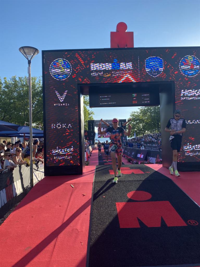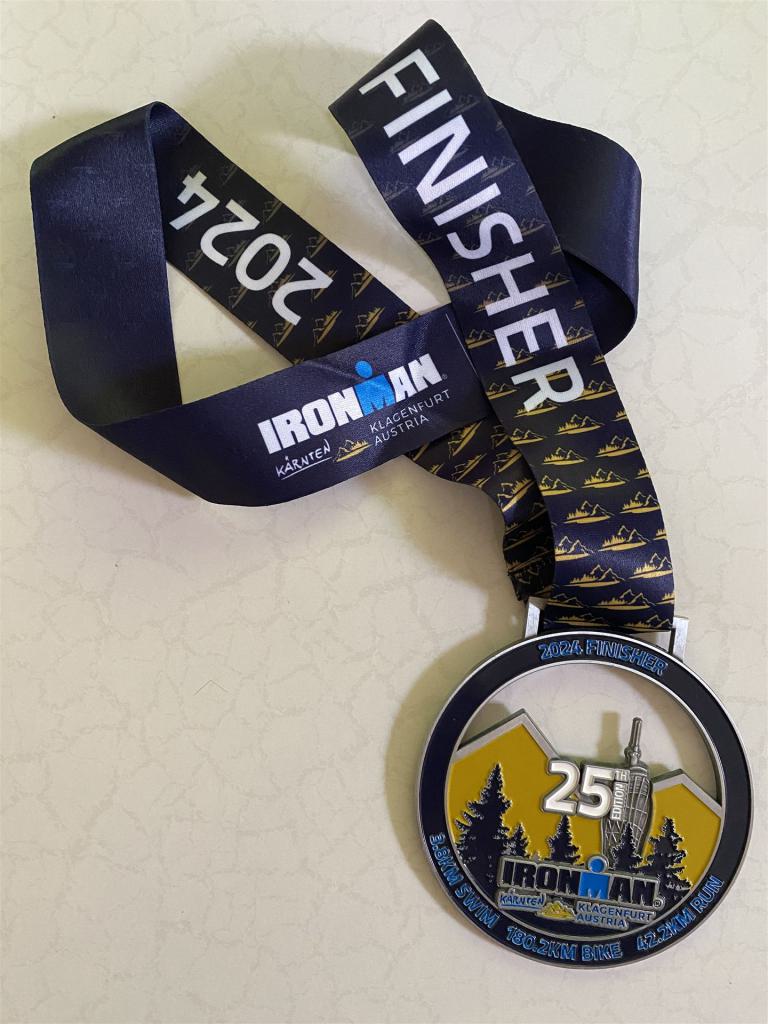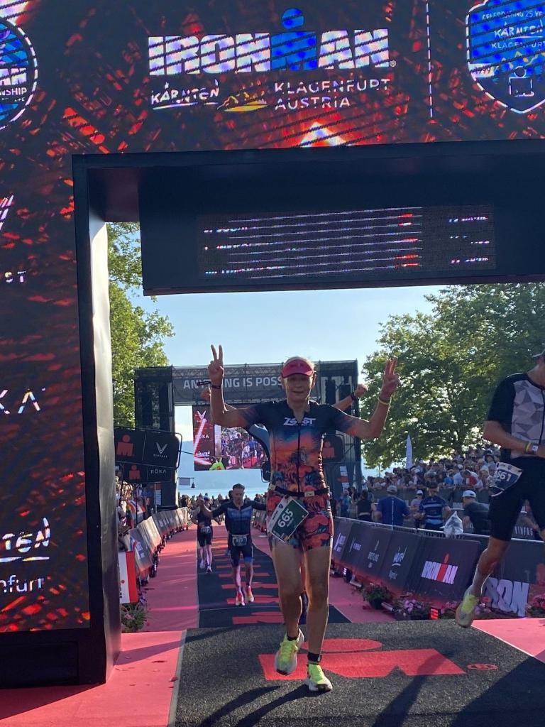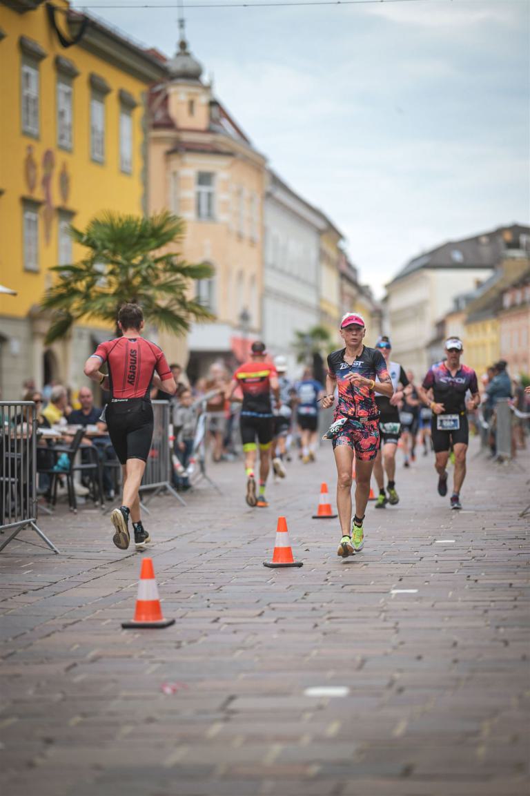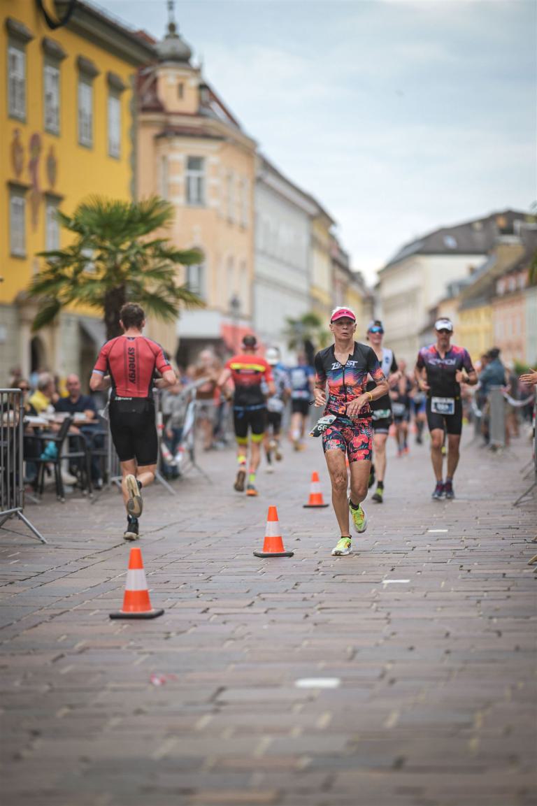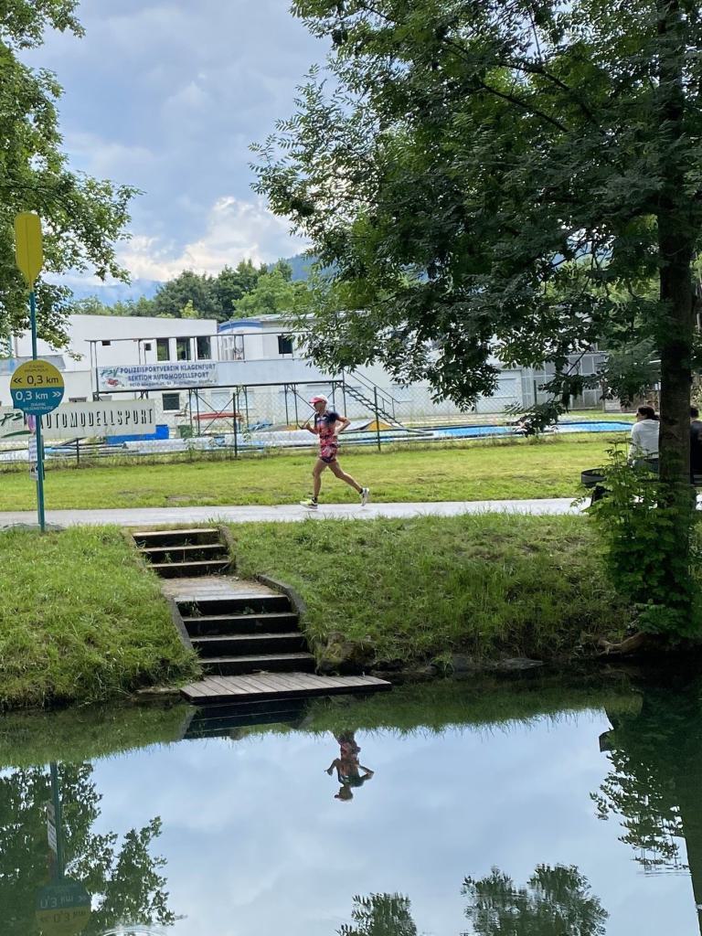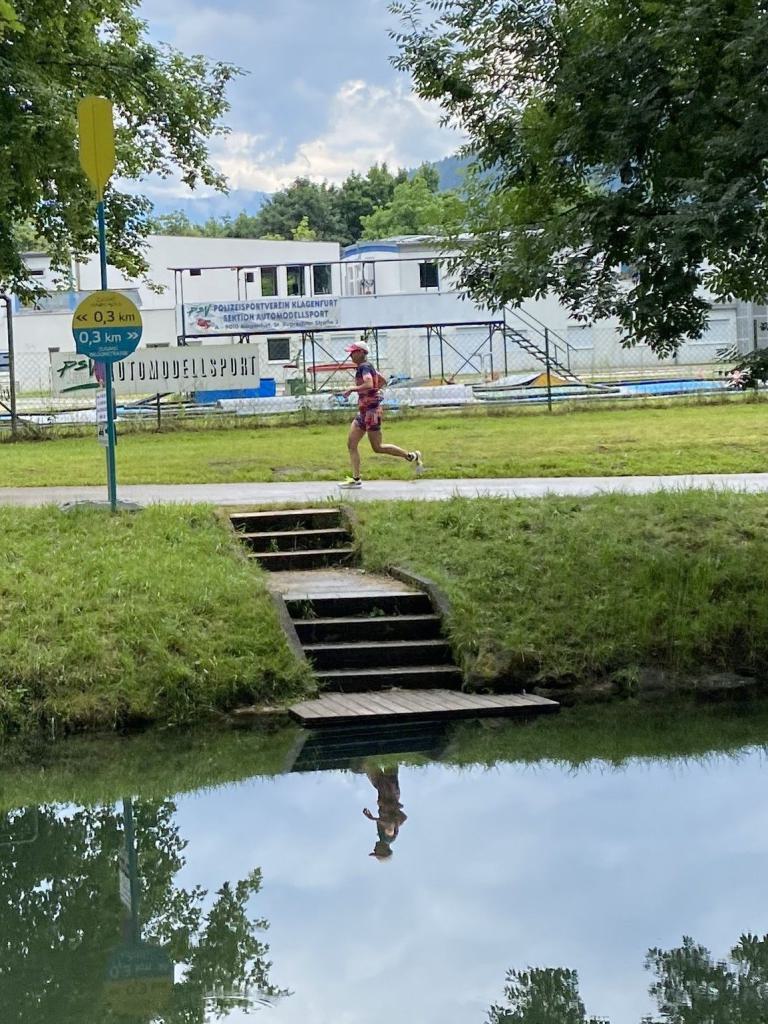 Ab in die Wechselzone und die Radschuhe mit den Laufschuhen tauschen. Aufgrund der Temperatur entscheide ich mich, mein Trikot anzulassen. Ich gehe als erste Frau in meiner AK mit einem Vorsprung von circa 18 Minuten auf die Laufstrecke. Nach dem ersten Kilometer geht es mir nicht so gut, ich fühle mich schlapp. Das kenne ich überhaupt nicht von mir. Anscheinend habe ich auf dem Rad nicht ausreichend gegessen. Normalerweise kann ich nach dem Rad direkt ohne Probleme los laufen, dieses Mal habe ich Probleme. Ich entscheide mich bis zur ersten Verpflegungsstelle Gehpausen einzulegen. An der ersten Verpflegungsstelle bin ich vorbei gelaufen, keine Ahnung weshalb. Das ist Wettkampf, da passieren solche Dingen. Bei der 2. Verpflegungsstelle nehme ich mir etwas Zeit und esse und trinke ordentlich. Danach geht es mir viel besser. Nach den ersten 10 Kilometern konnte ich meinen Vorsprung auf die Zweite bereits etwas ausbauen. Ich halte bei jeder Verpflegungsstelle an und nehme Flüssigkeit bzw. Gel zu mir. Der Vorsprung wird immer größer. Werner hält mich auf dem Laufenden. Ab circa Kilometer 32 habe ich Probleme mit der Verpflegung. Ich kann nichts mehr aufnehmen, mein Magen rebelliert. Ich entscheide spontan, dass ich es mit Cola probiere. Die Strategie geht auf, mein Magen rebelliert nicht mehr. Da ich bereits einen Vorsprung von über 45 Minuten auf den letzten 10 Kilometern habe gehe ich auf Nummer sicher. Ich nehme nur noch Cola zu mir und lege die ein- oder andere Gehpause ein. Ich bin zuversichtlich als Erste ins Ziel zu kommen. Bei Kilometer 39 bin ich schon leicht euphorisch, laufe jedoch weiter verhalten. Kein unnötiges Risiko eingehen. Bei Kilometer 41 fange ich an innerlich zu jubeln. Auf dem letzten Kilometer sind alle Probleme vergessen, es geht in Richtung Ziel. Der Zieleinlauf ist für jeden Athleten etwas Besonderes. Direkt im Ziel wartet bereits Werner auf mich und überreicht mir die Finisher Medaille. Das ist ein toller Moment. Natürlich habe ich, wie immer, vergessen auf meine Endzeit zu schauen. Wichtig für mich ist, ins Ziel zu kommen. Natürlich freut man sich, wenn dann noch eine gute Zeit bzw. Platzierung raus komm. Den Marathon bin ich in einer Zeit von 4:13:33 gelaufen. Meine Gesamtzeit beträgt 11:51:30 Stunden. Wahnsinn, ich bin total begeistert mit dieser Zeit gefinisht zu haben. Die Zweite in meiner AK kommt erst 1:17 Stunden nach mir ins Ziel. Es ist toll wieviel Zeit ich noch rauslaufen konnte. Es war wieder ein tolles Erlebnis in Klagenfurt und ich bin dankbar bei diesem Jubiläum dabei sein zu können. Nach dem Wettkampf gibt es noch eine Woche Urlaub und Erholung, danach geht der Focus auf die Weltmeisterschaft in Nizza.