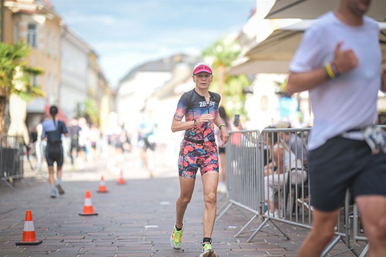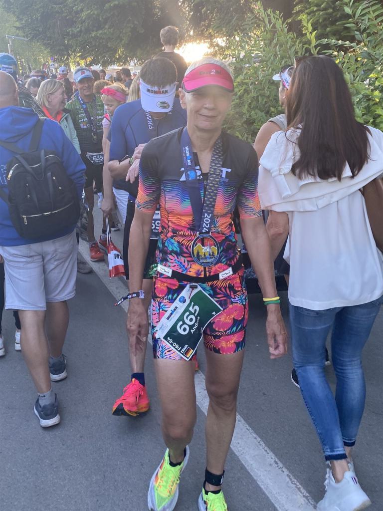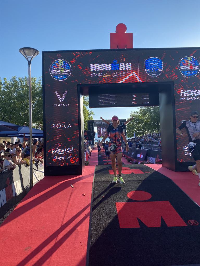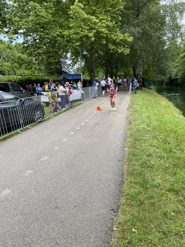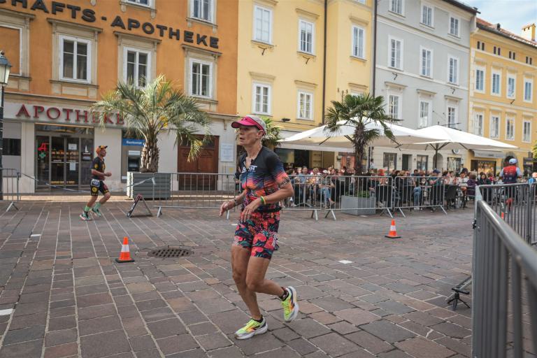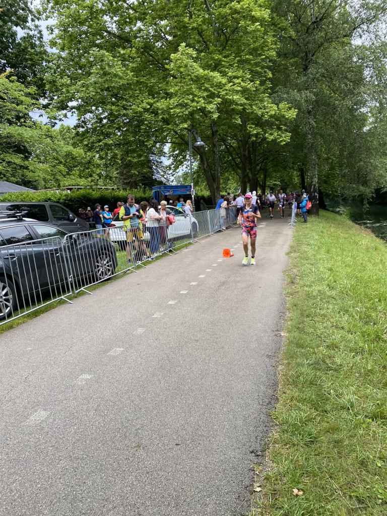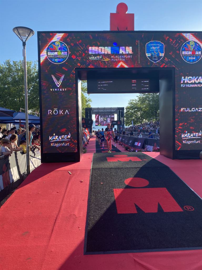 Ab in die Wechselzone und die Radschuhe mit den Laufschuhen tauschen. Aufgrund der Temperatur entscheide ich mich, mein Trikot anzulassen. Ich gehe als erste Frau in meiner AK mit einem Vorsprung von circa 18 Minuten auf die Laufstrecke. Nach dem ersten Kilometer geht es mir nicht so gut, ich fühle mich schlapp. Das kenne ich überhaupt nicht von mir. Anscheinend habe ich auf dem Rad nicht ausreichend gegessen. Normalerweise kann ich nach dem Rad direkt ohne Probleme los laufen, dieses Mal habe ich Probleme. Ich entscheide mich bis zur ersten Verpflegungsstelle Gehpausen einzulegen. An der ersten Verpflegungsstelle bin ich vorbei gelaufen, keine Ahnung weshalb. Das ist Wettkampf, da passieren solche Dingen. Bei der 2. Verpflegungsstelle nehme ich mir etwas Zeit und esse und trinke ordentlich. Danach geht es mir viel besser. Nach den ersten 10 Kilometern konnte ich meinen Vorsprung auf die Zweite bereits etwas ausbauen. Ich halte bei jeder Verpflegungsstelle an und nehme Flüssigkeit bzw. Gel zu mir. Der Vorsprung wird immer größer. Werner hält mich auf dem Laufenden. Ab circa Kilometer 32 habe ich Probleme mit der Verpflegung. Ich kann nichts mehr aufnehmen, mein Magen rebelliert. Ich entscheide spontan, dass ich es mit Cola probiere. Die Strategie geht auf, mein Magen rebelliert nicht mehr. Da ich bereits einen Vorsprung von über 45 Minuten auf den letzten 10 Kilometern habe gehe ich auf Nummer sicher. Ich nehme nur noch Cola zu mir und lege die ein- oder andere Gehpause ein. Ich bin zuversichtlich als Erste ins Ziel zu kommen. Bei Kilometer 39 bin ich schon leicht euphorisch, laufe jedoch weiter verhalten. Kein unnötiges Risiko eingehen. Bei Kilometer 41 fange ich an innerlich zu jubeln. Auf dem letzten Kilometer sind alle Probleme vergessen, es geht in Richtung Ziel. Der Zieleinlauf ist für jeden Athleten etwas Besonderes. Direkt im Ziel wartet bereits Werner auf mich und überreicht mir die Finisher Medaille. Das ist ein toller Moment. Natürlich habe ich, wie immer, vergessen auf meine Endzeit zu schauen. Wichtig für mich ist, ins Ziel zu kommen. Natürlich freut man sich, wenn dann noch eine gute Zeit bzw. Platzierung raus komm. Den Marathon bin ich in einer Zeit von 4:13:33 gelaufen. Meine Gesamtzeit beträgt 11:51:30 Stunden. Wahnsinn, ich bin total begeistert mit dieser Zeit gefinisht zu haben. Die Zweite in meiner AK kommt erst 1:17 Stunden nach mir ins Ziel. Es ist toll wieviel Zeit ich noch rauslaufen konnte. Es war wieder ein tolles Erlebnis in Klagenfurt und ich bin dankbar bei diesem Jubiläum dabei sein zu können. Nach dem Wettkampf gibt es noch eine Woche Urlaub und Erholung, danach geht der Focus auf die Weltmeisterschaft in Nizza.