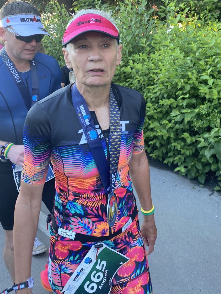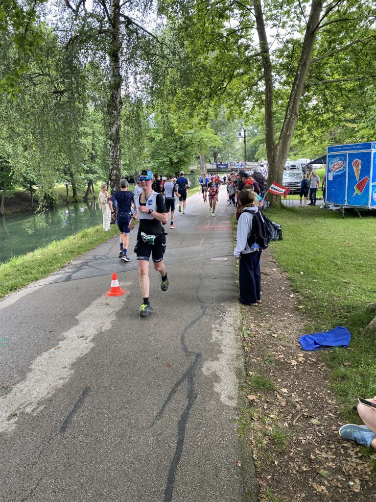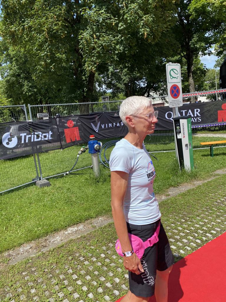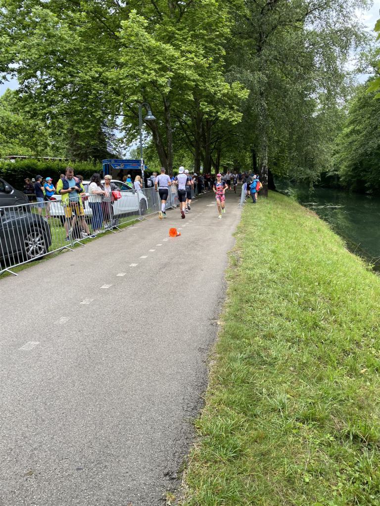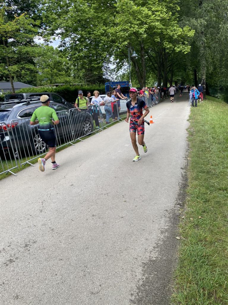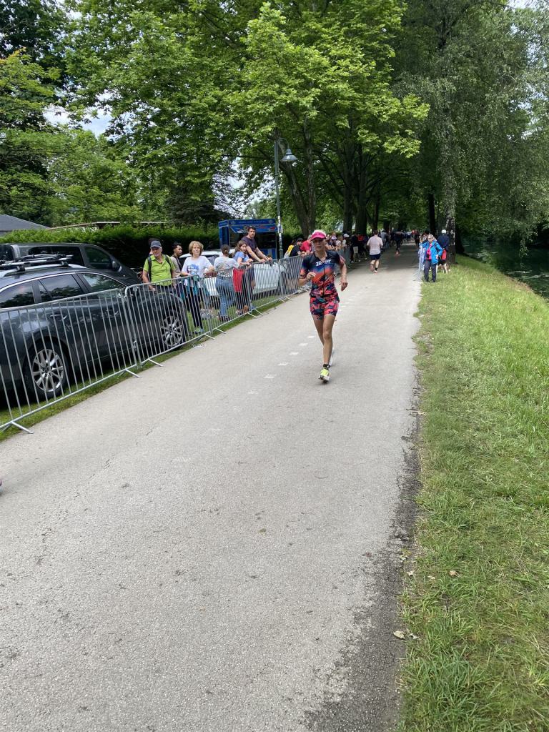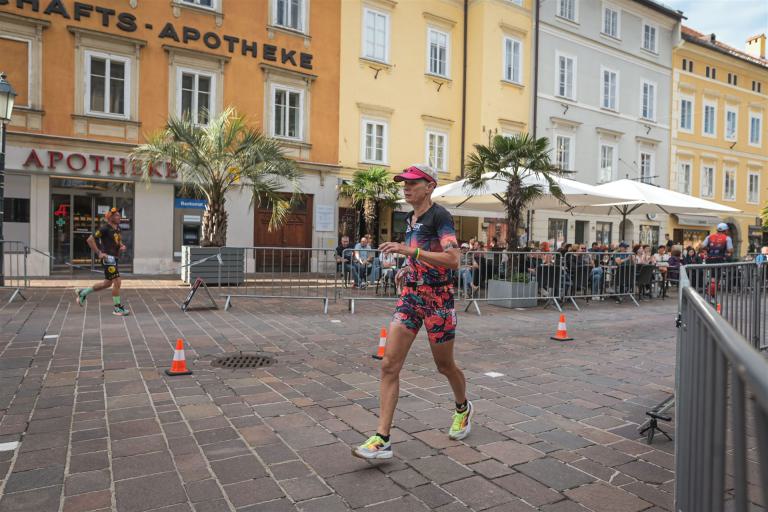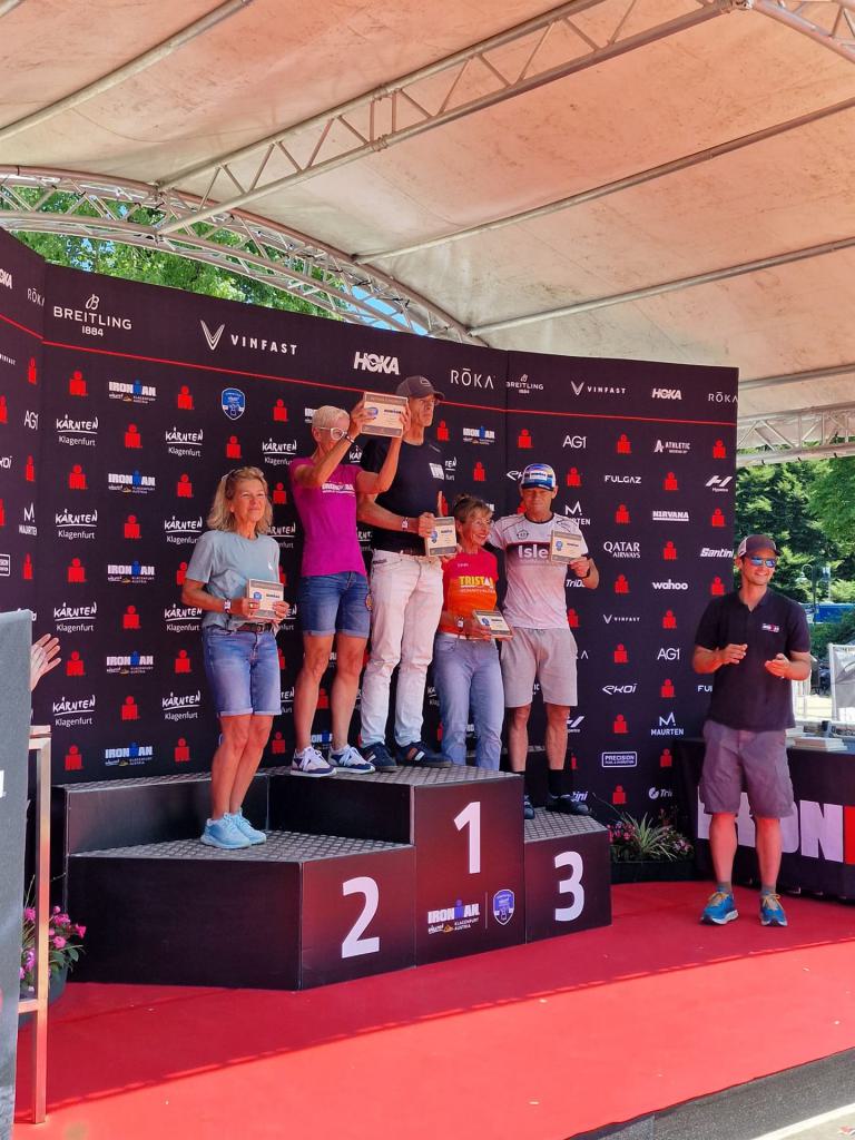 Ab in die Wechselzone und die Radschuhe mit den Laufschuhen tauschen. Aufgrund der Temperatur entscheide ich mich, mein Trikot anzulassen. Ich gehe als erste Frau in meiner AK mit einem Vorsprung von circa 18 Minuten auf die Laufstrecke. Nach dem ersten Kilometer geht es mir nicht so gut, ich fühle mich schlapp. Das kenne ich überhaupt nicht von mir. Anscheinend habe ich auf dem Rad nicht ausreichend gegessen. Normalerweise kann ich nach dem Rad direkt ohne Probleme los laufen, dieses Mal habe ich Probleme. Ich entscheide mich bis zur ersten Verpflegungsstelle Gehpausen einzulegen. An der ersten Verpflegungsstelle bin ich vorbei gelaufen, keine Ahnung weshalb. Das ist Wettkampf, da passieren solche Dingen. Bei der 2. Verpflegungsstelle nehme ich mir etwas Zeit und esse und trinke ordentlich. Danach geht es mir viel besser. Nach den ersten 10 Kilometern konnte ich meinen Vorsprung auf die Zweite bereits etwas ausbauen. Ich halte bei jeder Verpflegungsstelle an und nehme Flüssigkeit bzw. Gel zu mir. Der Vorsprung wird immer größer. Werner hält mich auf dem Laufenden. Ab circa Kilometer 32 habe ich Probleme mit der Verpflegung. Ich kann nichts mehr aufnehmen, mein Magen rebelliert. Ich entscheide spontan, dass ich es mit Cola probiere. Die Strategie geht auf, mein Magen rebelliert nicht mehr. Da ich bereits einen Vorsprung von über 45 Minuten auf den letzten 10 Kilometern habe gehe ich auf Nummer sicher. Ich nehme nur noch Cola zu mir und lege die ein- oder andere Gehpause ein. Ich bin zuversichtlich als Erste ins Ziel zu kommen. Bei Kilometer 39 bin ich schon leicht euphorisch, laufe jedoch weiter verhalten. Kein unnötiges Risiko eingehen. Bei Kilometer 41 fange ich an innerlich zu jubeln. Auf dem letzten Kilometer sind alle Probleme vergessen, es geht in Richtung Ziel. Der Zieleinlauf ist für jeden Athleten etwas Besonderes. Direkt im Ziel wartet bereits Werner auf mich und überreicht mir die Finisher Medaille. Das ist ein toller Moment. Natürlich habe ich, wie immer, vergessen auf meine Endzeit zu schauen. Wichtig für mich ist, ins Ziel zu kommen. Natürlich freut man sich, wenn dann noch eine gute Zeit bzw. Platzierung raus komm. Den Marathon bin ich in einer Zeit von 4:13:33 gelaufen. Meine Gesamtzeit beträgt 11:51:30 Stunden. Wahnsinn, ich bin total begeistert mit dieser Zeit gefinisht zu haben. Die Zweite in meiner AK kommt erst 1:17 Stunden nach mir ins Ziel. Es ist toll wieviel Zeit ich noch rauslaufen konnte. Es war wieder ein tolles Erlebnis in Klagenfurt und ich bin dankbar bei diesem Jubiläum dabei sein zu können. Nach dem Wettkampf gibt es noch eine Woche Urlaub und Erholung, danach geht der Focus auf die Weltmeisterschaft in Nizza.