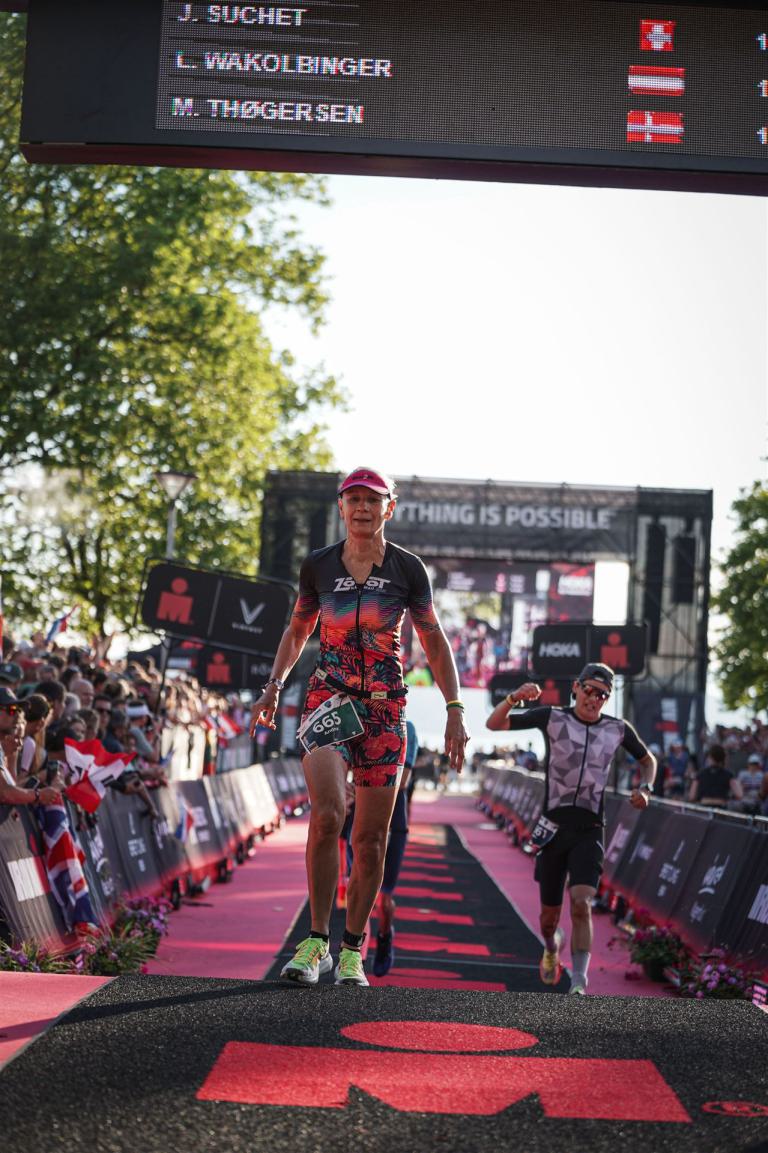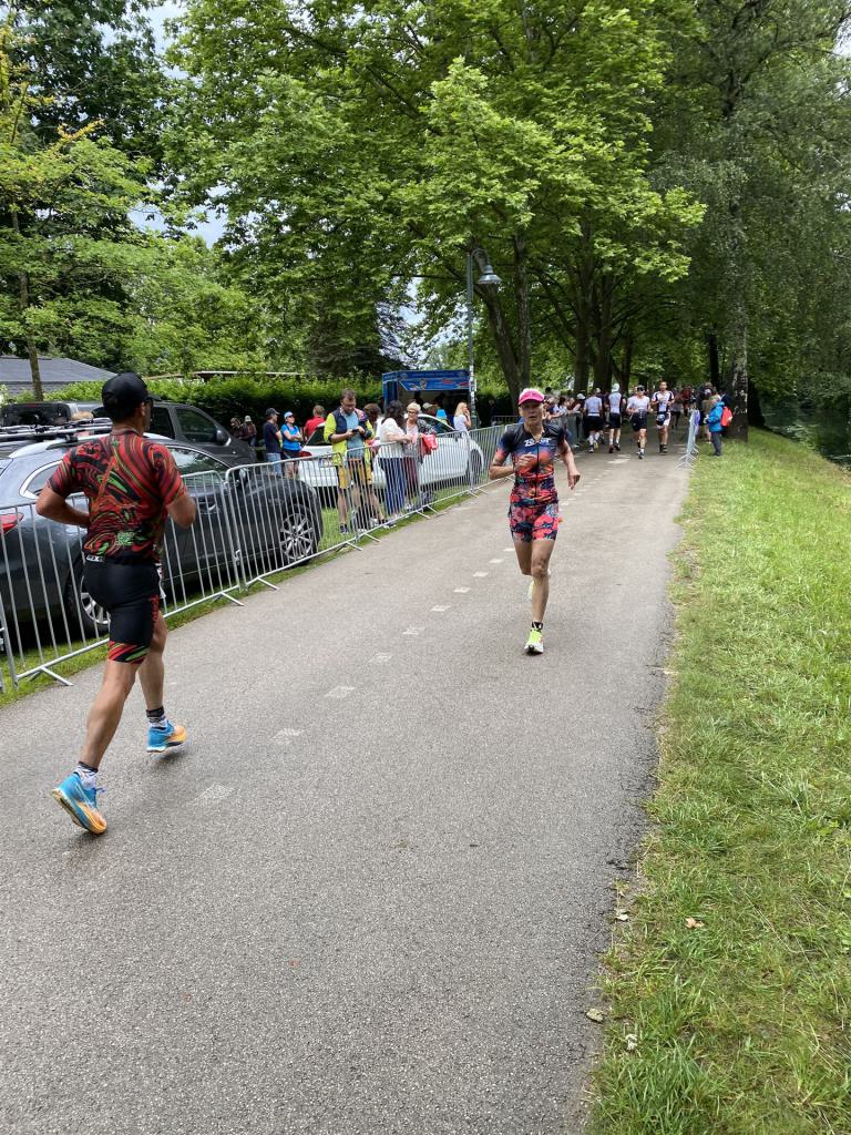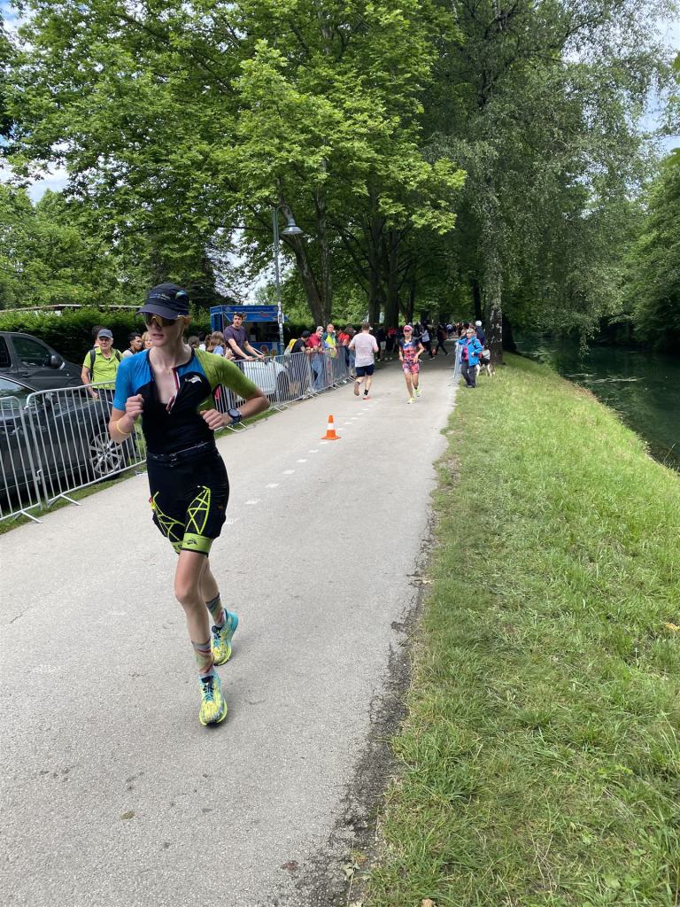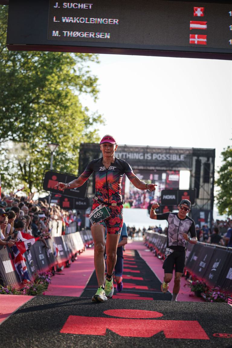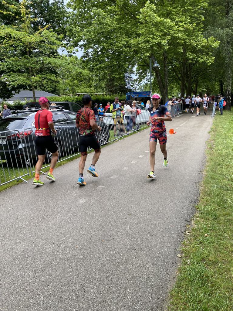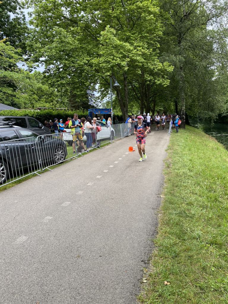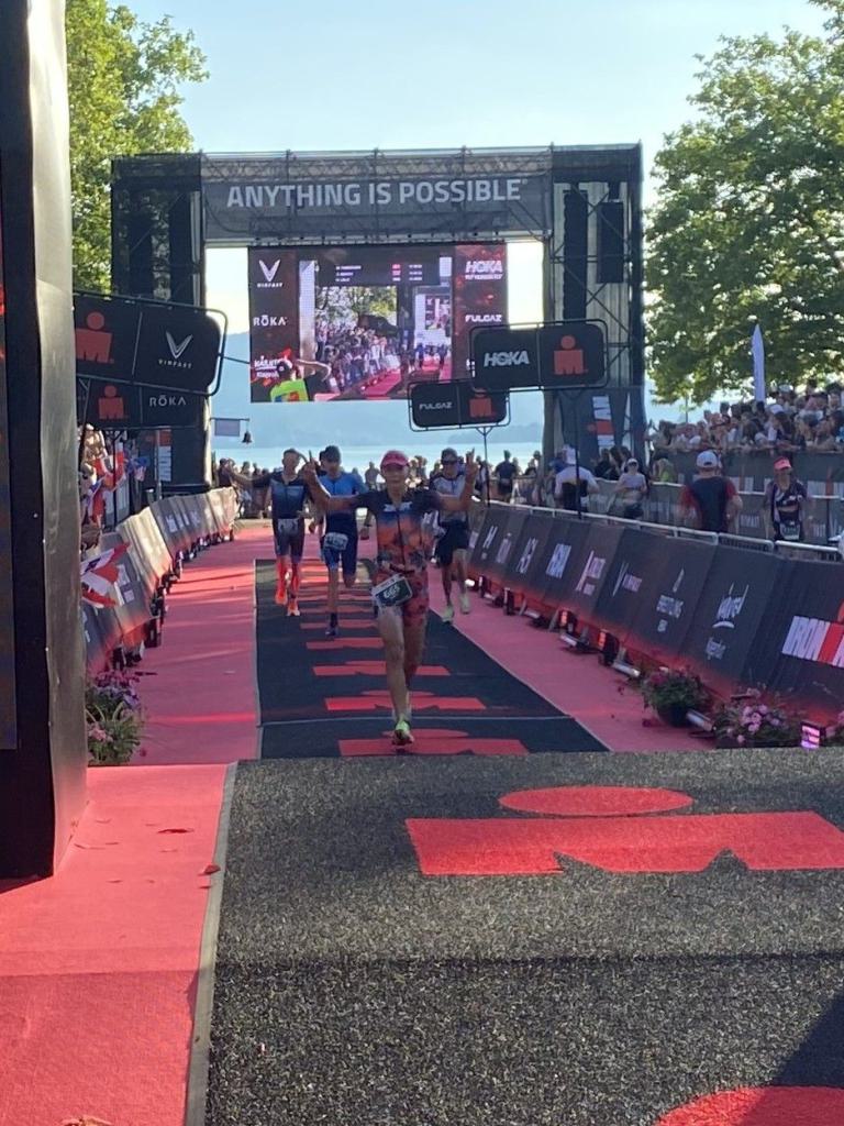Ab in die Wechselzone und die Radschuhe mit den Laufschuhen tauschen. Aufgrund der Temperatur entscheide ich mich, mein Trikot anzulassen. Ich gehe als erste Frau in meiner AK mit einem Vorsprung von circa 18 Minuten auf die Laufstrecke. Nach dem ersten Kilometer geht es mir nicht so gut, ich fühle mich schlapp. Das kenne ich überhaupt nicht von mir. Anscheinend habe ich auf dem Rad nicht ausreichend gegessen. Normalerweise kann ich nach dem Rad direkt ohne Probleme los laufen, dieses Mal habe ich Probleme. Ich entscheide mich bis zur ersten Verpflegungsstelle Gehpausen einzulegen. An der ersten Verpflegungsstelle bin ich vorbei gelaufen, keine Ahnung weshalb. Das ist Wettkampf, da passieren solche Dingen. Bei der 2. Verpflegungsstelle nehme ich mir etwas Zeit und esse und trinke ordentlich. Danach geht es mir viel besser. Nach den ersten 10 Kilometern konnte ich meinen Vorsprung auf die Zweite bereits etwas ausbauen. Ich halte bei jeder Verpflegungsstelle an und nehme Flüssigkeit bzw. Gel zu mir. Der Vorsprung wird immer größer. Werner hält mich auf dem Laufenden. Ab circa Kilometer 32 habe ich Probleme mit der Verpflegung. Ich kann nichts mehr aufnehmen, mein Magen rebelliert. Ich entscheide spontan, dass ich es mit Cola probiere. Die Strategie geht auf, mein Magen rebelliert nicht mehr. Da ich bereits einen Vorsprung von über 45 Minuten auf den letzten 10 Kilometern habe gehe ich auf Nummer sicher. Ich nehme nur noch Cola zu mir und lege die ein- oder andere Gehpause ein. Ich bin zuversichtlich als Erste ins Ziel zu kommen. Bei Kilometer 39 bin ich schon leicht euphorisch, laufe jedoch weiter verhalten. Kein unnötiges Risiko eingehen. Bei Kilometer 41 fange ich an innerlich zu jubeln. Auf dem letzten Kilometer sind alle Probleme vergessen, es geht in Richtung Ziel. Der Zieleinlauf ist für jeden Athleten etwas Besonderes. Direkt im Ziel wartet bereits Werner auf mich und überreicht mir die Finisher Medaille. Das ist ein toller Moment. Natürlich habe ich, wie immer, vergessen auf meine Endzeit zu schauen. Wichtig für mich ist, ins Ziel zu kommen. Natürlich freut man sich, wenn dann noch eine gute Zeit bzw. Platzierung raus komm. Den Marathon bin ich in einer Zeit von 4:13:33 gelaufen. Meine Gesamtzeit beträgt 11:51:30 Stunden. Wahnsinn, ich bin total begeistert mit dieser Zeit gefinisht zu haben. Die Zweite in meiner AK kommt erst 1:17 Stunden nach mir ins Ziel. Es ist toll wieviel Zeit ich noch rauslaufen konnte. Es war wieder ein tolles Erlebnis in Klagenfurt und ich bin dankbar bei diesem Jubiläum dabei sein zu können. Nach dem Wettkampf gibt es noch eine Woche Urlaub und Erholung, danach geht der Focus auf die Weltmeisterschaft in Nizza.