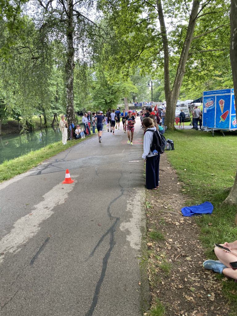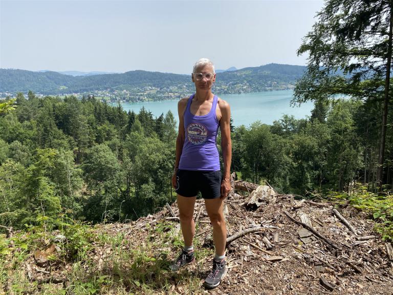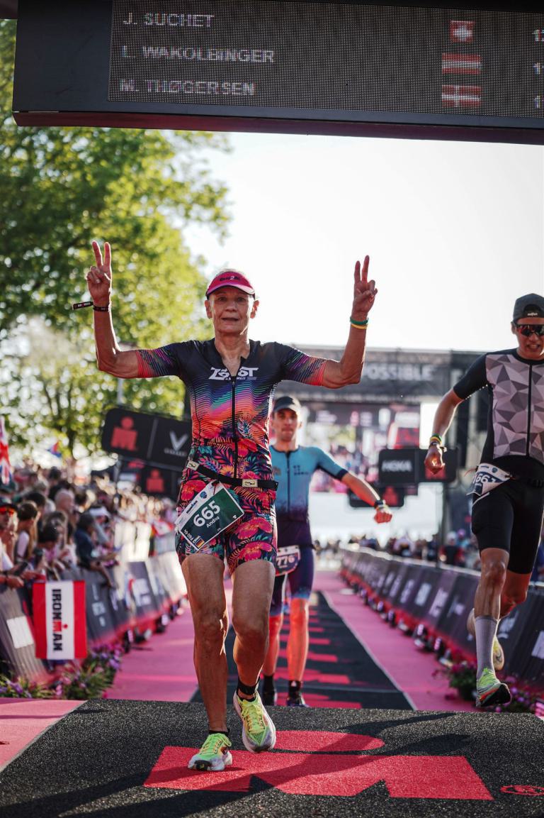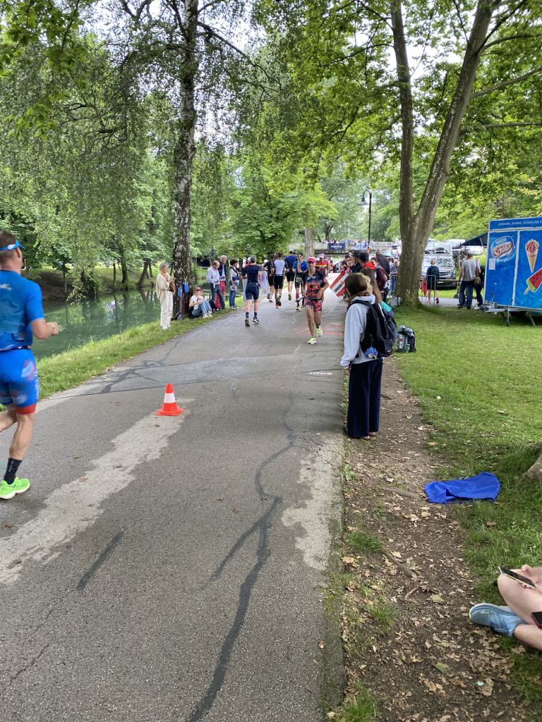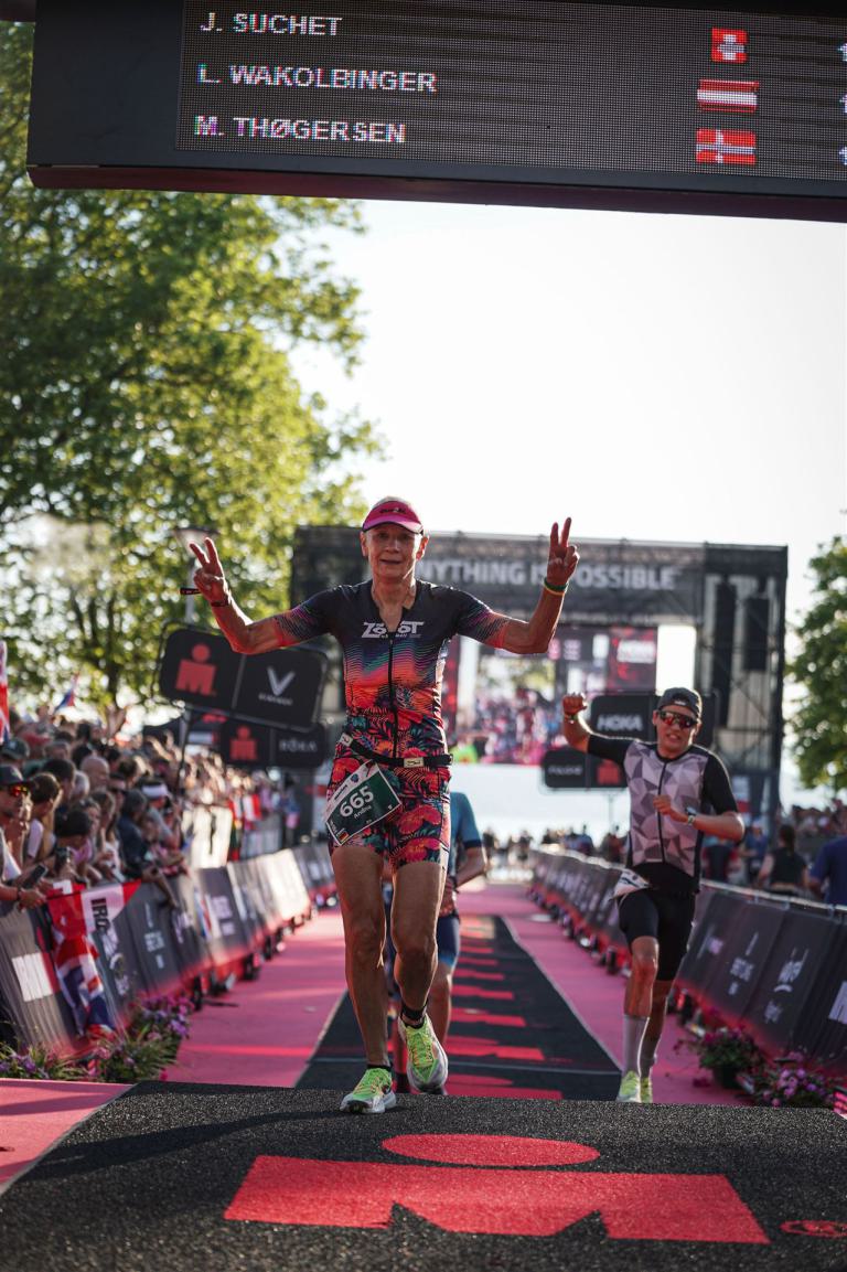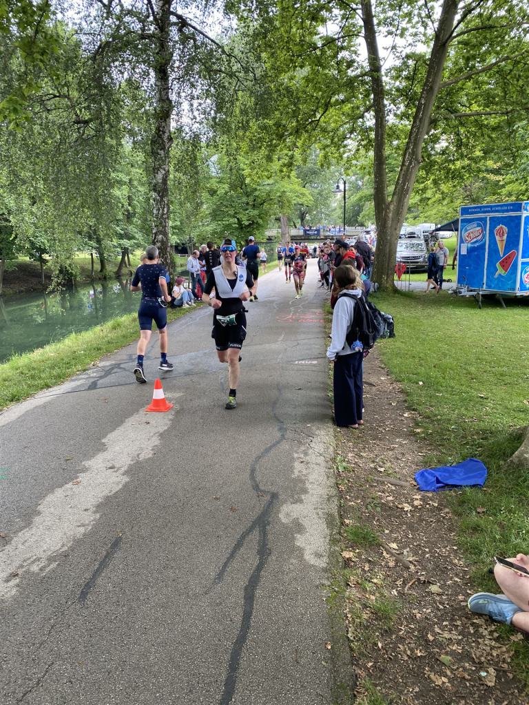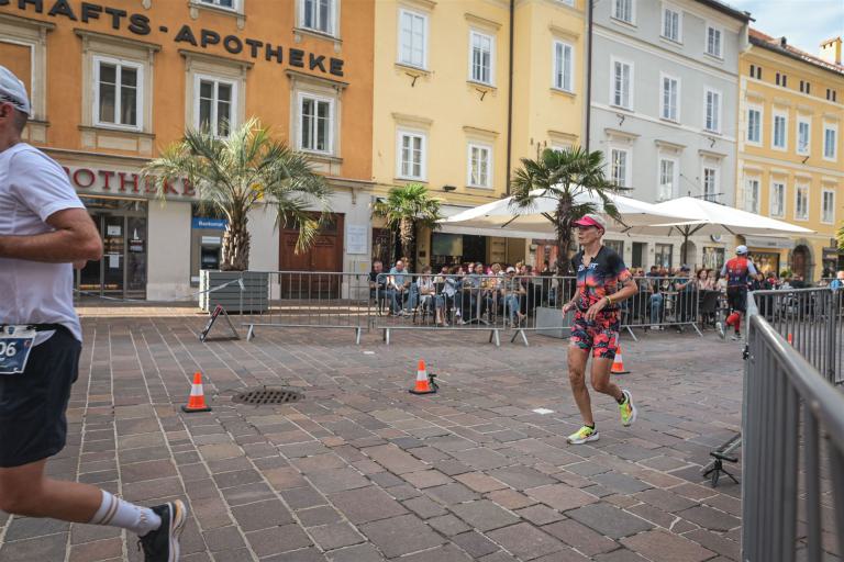 Ab in die Wechselzone und die Radschuhe mit den Laufschuhen tauschen. Aufgrund der Temperatur entscheide ich mich, mein Trikot anzulassen. Ich gehe als erste Frau in meiner AK mit einem Vorsprung von circa 18 Minuten auf die Laufstrecke. Nach dem ersten Kilometer geht es mir nicht so gut, ich fühle mich schlapp. Das kenne ich überhaupt nicht von mir. Anscheinend habe ich auf dem Rad nicht ausreichend gegessen. Normalerweise kann ich nach dem Rad direkt ohne Probleme los laufen, dieses Mal habe ich Probleme. Ich entscheide mich bis zur ersten Verpflegungsstelle Gehpausen einzulegen. An der ersten Verpflegungsstelle bin ich vorbei gelaufen, keine Ahnung weshalb. Das ist Wettkampf, da passieren solche Dingen. Bei der 2. Verpflegungsstelle nehme ich mir etwas Zeit und esse und trinke ordentlich. Danach geht es mir viel besser. Nach den ersten 10 Kilometern konnte ich meinen Vorsprung auf die Zweite bereits etwas ausbauen. Ich halte bei jeder Verpflegungsstelle an und nehme Flüssigkeit bzw. Gel zu mir. Der Vorsprung wird immer größer. Werner hält mich auf dem Laufenden. Ab circa Kilometer 32 habe ich Probleme mit der Verpflegung. Ich kann nichts mehr aufnehmen, mein Magen rebelliert. Ich entscheide spontan, dass ich es mit Cola probiere. Die Strategie geht auf, mein Magen rebelliert nicht mehr. Da ich bereits einen Vorsprung von über 45 Minuten auf den letzten 10 Kilometern habe gehe ich auf Nummer sicher. Ich nehme nur noch Cola zu mir und lege die ein- oder andere Gehpause ein. Ich bin zuversichtlich als Erste ins Ziel zu kommen. Bei Kilometer 39 bin ich schon leicht euphorisch, laufe jedoch weiter verhalten. Kein unnötiges Risiko eingehen. Bei Kilometer 41 fange ich an innerlich zu jubeln. Auf dem letzten Kilometer sind alle Probleme vergessen, es geht in Richtung Ziel. Der Zieleinlauf ist für jeden Athleten etwas Besonderes. Direkt im Ziel wartet bereits Werner auf mich und überreicht mir die Finisher Medaille. Das ist ein toller Moment. Natürlich habe ich, wie immer, vergessen auf meine Endzeit zu schauen. Wichtig für mich ist, ins Ziel zu kommen. Natürlich freut man sich, wenn dann noch eine gute Zeit bzw. Platzierung raus komm. Den Marathon bin ich in einer Zeit von 4:13:33 gelaufen. Meine Gesamtzeit beträgt 11:51:30 Stunden. Wahnsinn, ich bin total begeistert mit dieser Zeit gefinisht zu haben. Die Zweite in meiner AK kommt erst 1:17 Stunden nach mir ins Ziel. Es ist toll wieviel Zeit ich noch rauslaufen konnte. Es war wieder ein tolles Erlebnis in Klagenfurt und ich bin dankbar bei diesem Jubiläum dabei sein zu können. Nach dem Wettkampf gibt es noch eine Woche Urlaub und Erholung, danach geht der Focus auf die Weltmeisterschaft in Nizza.