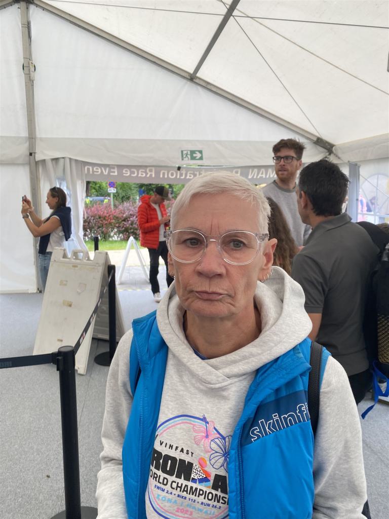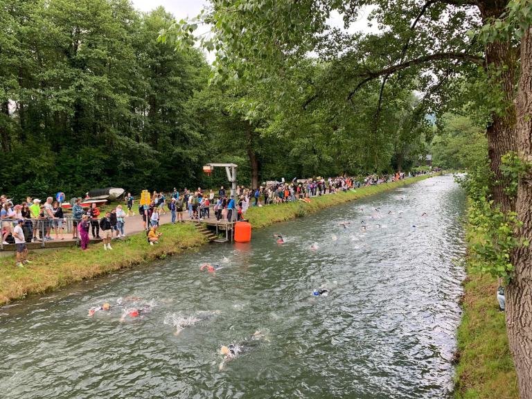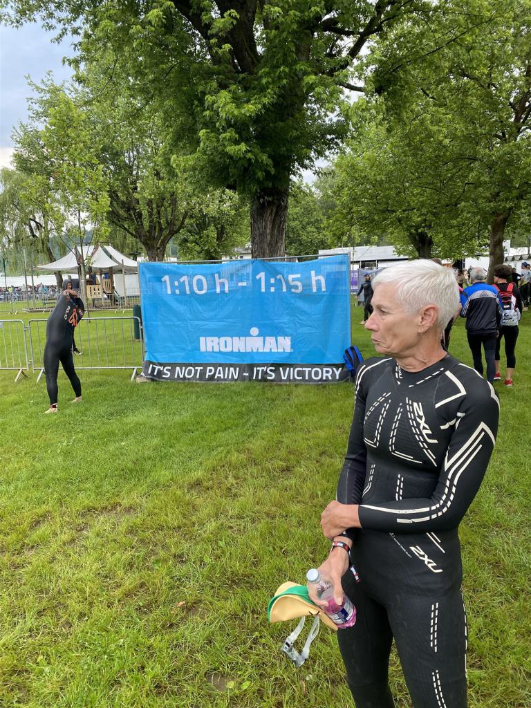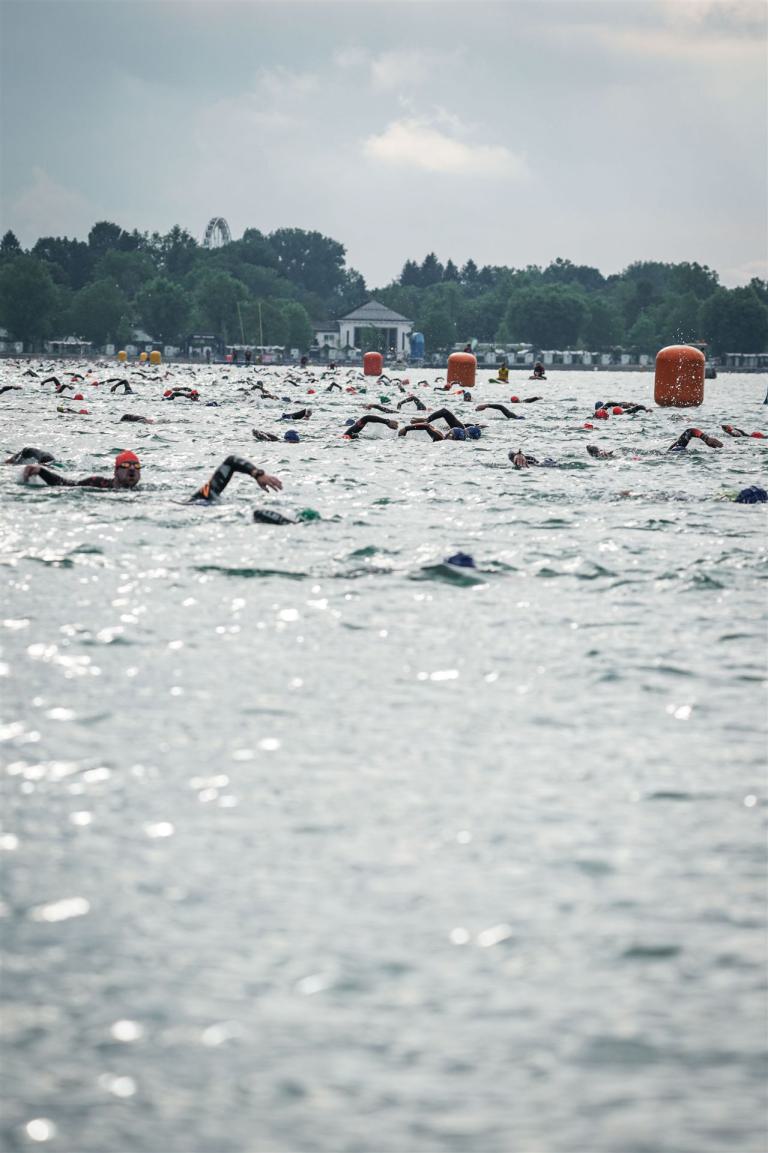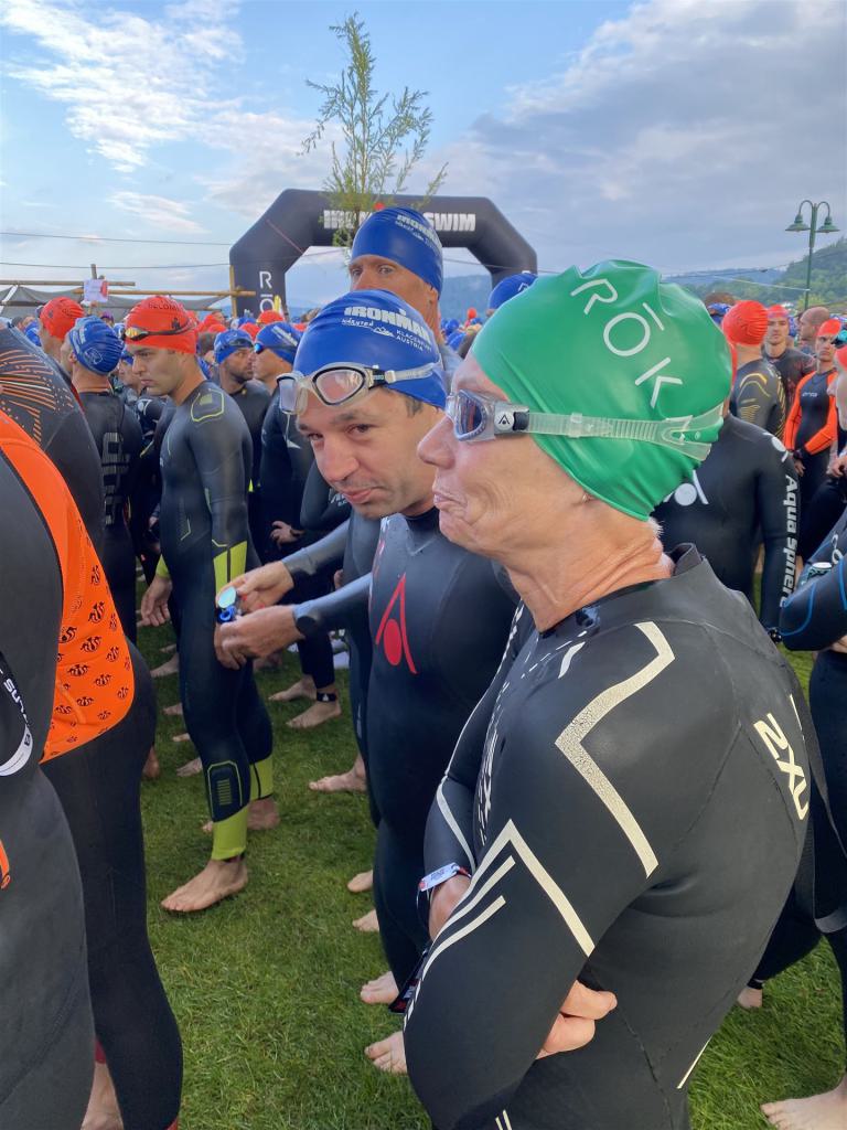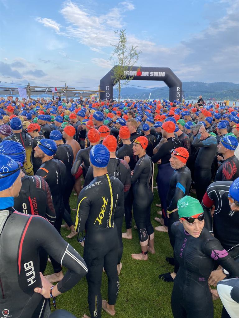 Geschwommen werden die 3,8 Kilometer im Wörthersee. Der See hat Trinkwasserqualität und ist relativ klar. Gestartet wird in Gruppen, man ordnet sich entsprechend der voraussichtlichen Schwimmzeit in eine Gruppe ein. Die Profimänner starteten um 6:30 Uhr, es gab keine Profifrauen. Ab 6:40 Uhr gingen die Agegrouper ins Wasser. Da ich keine Uhr beim Wettkampf trage konnte ich nicht einschätzen, wie lange es gedauert hat, bis ich ins Wasser konnte. Alle 5 Sekunden gingen 4 Athleten ins Wasser. Das Schwimmen war relativ entspannt, ich wurde nicht oft überholt und habe auch wenige Athleten überholt. Ich denke, die meisten Athleten haben sich korrekt eingeordnet. Der erste Streckenabschnitt klappt super, ich kann die Bojen sehr gut erkennen. Beim Rückweg in Richtung Lendkanal hatte ich leichte Schwierigkeiten mit den Bojen. War aber nicht schlimm für mich, ich habe mich an den anderen Athleten orientiert. Den Eingang zum Lendkanal konnte ich nicht erkennen, ohne Brille und dann noch direkt die Sonne, da habe mich absolut auf die anderen verlassen. Erstaunlicherweise hielt sich das Gedränge im Lendkanal auch in Grenzen, ich hatte mich Mental auf dichtes Gedränge und evtl. auch Schläge eingestellt. Nichts davon ist passiert. Das Schöne an diesem Kanal sind die Zuschauer auf beiden Seiten, die Stimmung ist super. Der Schwimmausstieg ist am Parkhotel, die Strecke bis in die Wechselzone ist relativ lang. Ich komme als 2. Frau in meiner AK aus dem Wasser. Mit meiner Schwimmzeit von 1:19:50 bin ich zufrieden.