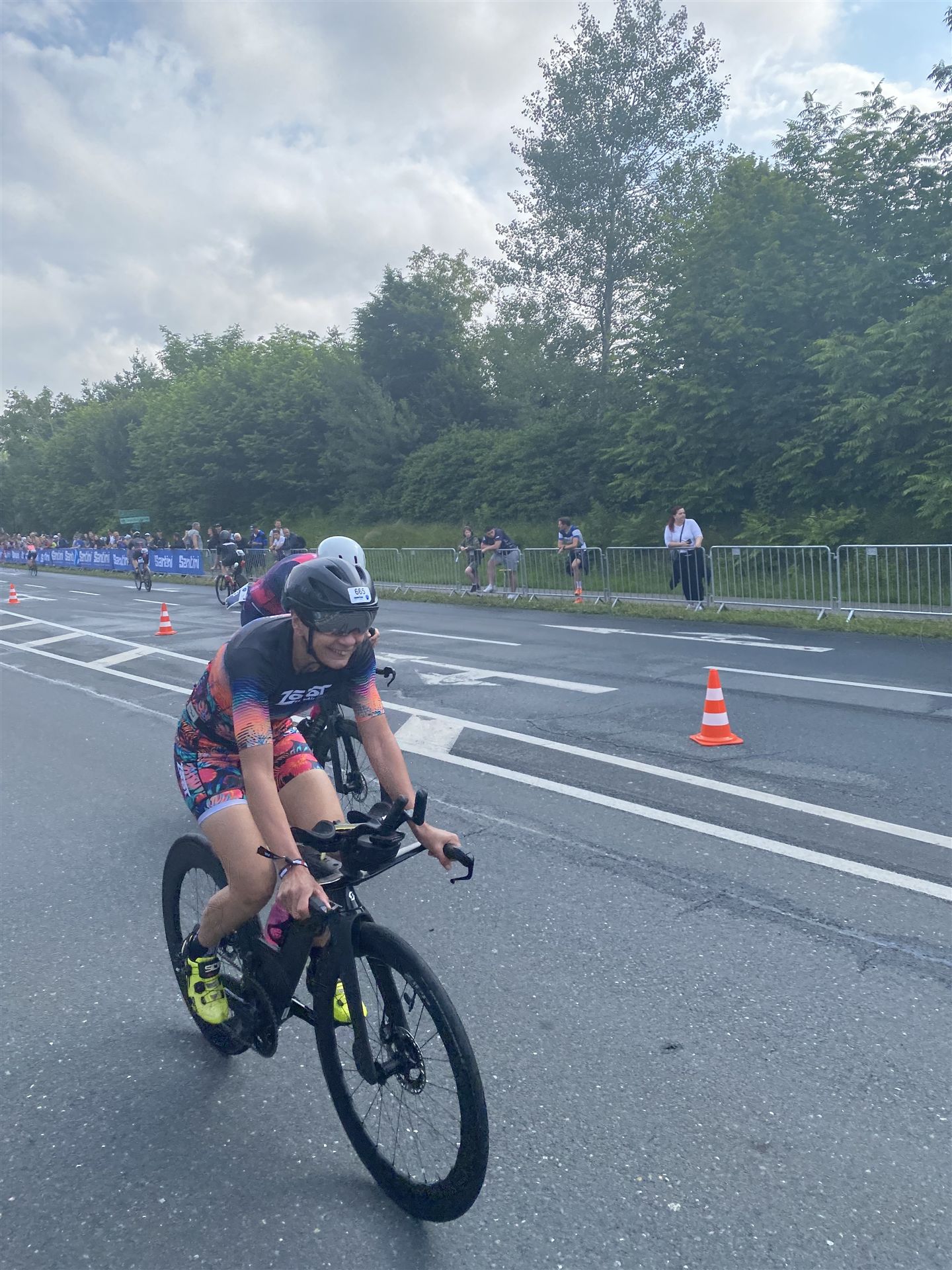 Aufgrund der für meine Verhältnisse niedrigen Temperaturen ziehe ich Socken mit klassischen Rennradschuhen sowie ein Trikot über. Das war die beste Entscheidung. Das erste Stück der Radstrecke führt am Wörthersee entlang. Die Straßen sind noch nass vom Regen, dafür ist die Aussicht traumhaft. Es lässt sich relativ gut fahren, durch den Rolling-Start ist das Feld nicht so dicht. Selbstverständlich muss man schauen, dass man keinen Windschatten fährt, es klappt aber ganz gut. Der erste längere Anstieg ist der Faaker See. Aufgrund der Wetterverhältnisse sind nicht viele Zuschauer am Anstieg. Ich kurble den Anstieg im kleinen Gang hoch, ist kein Problem für mich. Danach kommt ein flaches Stück, da gibt es immer relativ viel Gegenwind. Ich fühle mich sehr gut auf dem Rad, habe Druck auf den Pedalen und kann den Wettkampf genießen. Die Wettervorhersage passt leider nicht ganz zum tatsächlichen Wetter. Es gibt Strecken mit Starkregen, die Straßen sind sehr nass, bei den Abfahrten muss man aufpassen. Den zweiten längeren Anstieg (Ruperti Berg) fahre ich auch ohne Probleme, bei den Abfahrten muss man aufpassen. Der 180 Kilometerkurs besteht aus 2 Runden. Die Anstiege müssen zweimal gefahren werden. Auf der zweiten Runde sind die Steigungen dann doch etwas schwerer. Insgesamt bin ich mit meiner Radzeit von 6:01:37 Stunden sehr zu frieden.
