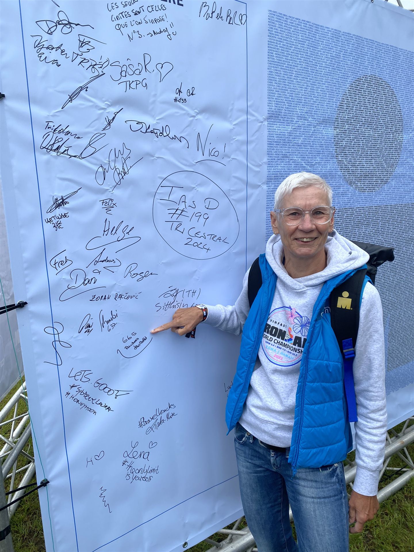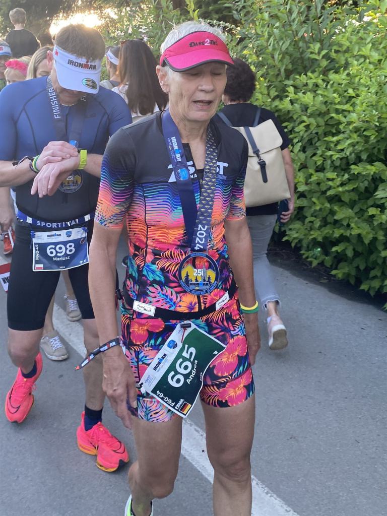 Ab in die Wechselzone und die Radschuhe mit den Laufschuhen tauschen. Aufgrund der Temperatur entscheide ich mich, mein Trikot anzulassen. Ich gehe als erste Frau in meiner AK mit einem Vorsprung von circa 18 Minuten auf die Laufstrecke. Nach dem ersten Kilometer geht es mir nicht so gut, ich fühle mich schlapp. Das kenne ich überhaupt nicht von mir. Anscheinend habe ich auf dem Rad nicht ausreichend gegessen. Normalerweise kann ich nach dem Rad direkt ohne Probleme los laufen, dieses Mal habe ich Probleme. Ich entscheide mich bis zur ersten Verpflegungsstelle Gehpausen einzulegen. An der ersten Verpflegungsstelle bin ich vorbei gelaufen, keine Ahnung weshalb. Das ist Wettkampf, da passieren solche Dingen. Bei der 2. Verpflegungsstelle nehme ich mir etwas Zeit und esse und trinke ordentlich. Danach geht es mir viel besser. Nach den ersten 10 Kilometern konnte ich meinen Vorsprung auf die Zweite bereits etwas ausbauen. Ich halte bei jeder Verpflegungsstelle an und nehme Flüssigkeit bzw. Gel zu mir. Der Vorsprung wird immer größer. Werner hält mich auf dem Laufenden. Ab circa Kilometer 32 habe ich Probleme mit der Verpflegung. Ich kann nichts mehr aufnehmen, mein Magen rebelliert. Ich entscheide spontan, dass ich es mit Cola probiere. Die Strategie geht auf, mein Magen rebelliert nicht mehr. Da ich bereits einen Vorsprung von über 45 Minuten auf den letzten 10 Kilometern habe gehe ich auf Nummer sicher. Ich nehme nur noch Cola zu mir und lege die ein- oder andere Gehpause ein. Ich bin zuversichtlich als Erste ins Ziel zu kommen. Bei Kilometer 39 bin ich schon leicht euphorisch, laufe jedoch weiter verhalten. Kein unnötiges Risiko eingehen. Bei Kilometer 41 fange ich an innerlich zu jubeln. Auf dem letzten Kilometer sind alle Probleme vergessen, es geht in Richtung Ziel. Der Zieleinlauf ist für jeden Athleten etwas Besonderes. Direkt im Ziel wartet bereits Werner auf mich und überreicht mir die Finisher Medaille. Das ist ein toller Moment. Natürlich habe ich, wie immer, vergessen auf meine Endzeit zu schauen. Wichtig für mich ist, ins Ziel zu kommen. Natürlich freut man sich, wenn dann noch eine gute Zeit bzw. Platzierung raus komm. Den Marathon bin ich in einer Zeit von 4:13:33 gelaufen. Meine Gesamtzeit beträgt 11:51:30 Stunden. Wahnsinn, ich bin total begeistert mit dieser Zeit gefinisht zu haben. Die Zweite in meiner AK kommt erst 1:17 Stunden nach mir ins Ziel. Es ist toll wieviel Zeit ich noch rauslaufen konnte. Es war wieder ein tolles Erlebnis in Klagenfurt und ich bin dankbar bei diesem Jubiläum dabei sein zu können. Nach dem Wettkampf gibt es noch eine Woche Urlaub und Erholung, danach geht der Focus auf die Weltmeisterschaft in Nizza.